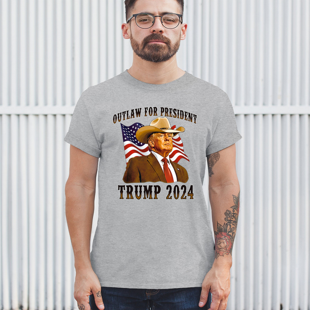 Bold "Outlaw for President" Trump 2024 design for conservative supporters, featuring Donald J. Trump and the American flag. Show your patriotism.