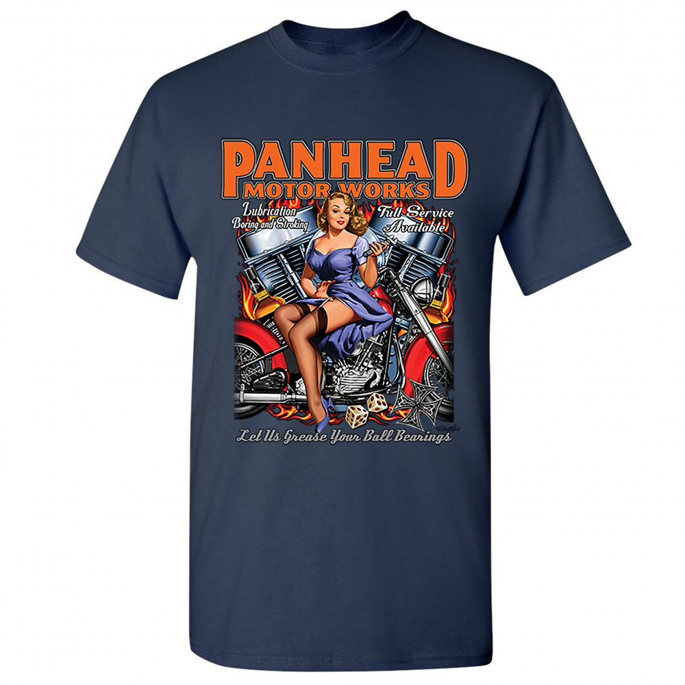 A print featuring a sexy pin-up girl sitting on a chopper motorcycle holding a wrench. In the background there is a V-engine. The print says: "Panhead motor works, Lubrication boring and stroking, Full service available, Let us grease your ball bearings".