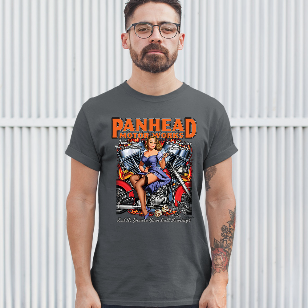 A print featuring a sexy pin-up girl sitting on a chopper motorcycle holding a wrench. In the background there is a V-engine. The print says: "Panhead motor works, Lubrication boring and stroking, Full service available, Let us grease your ball bearings".