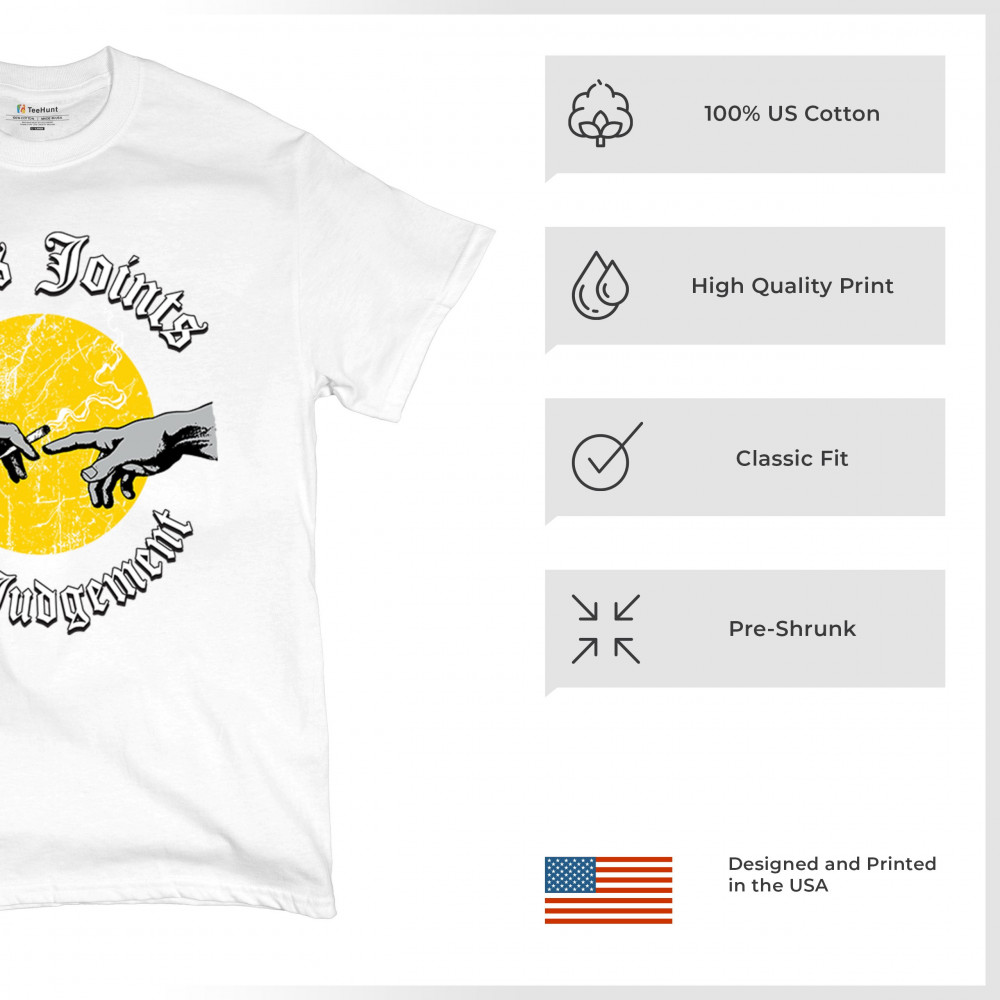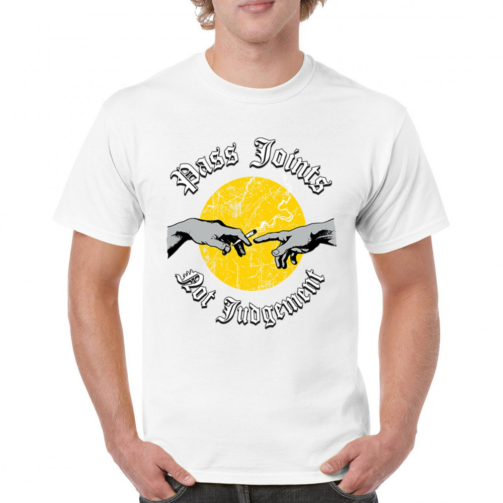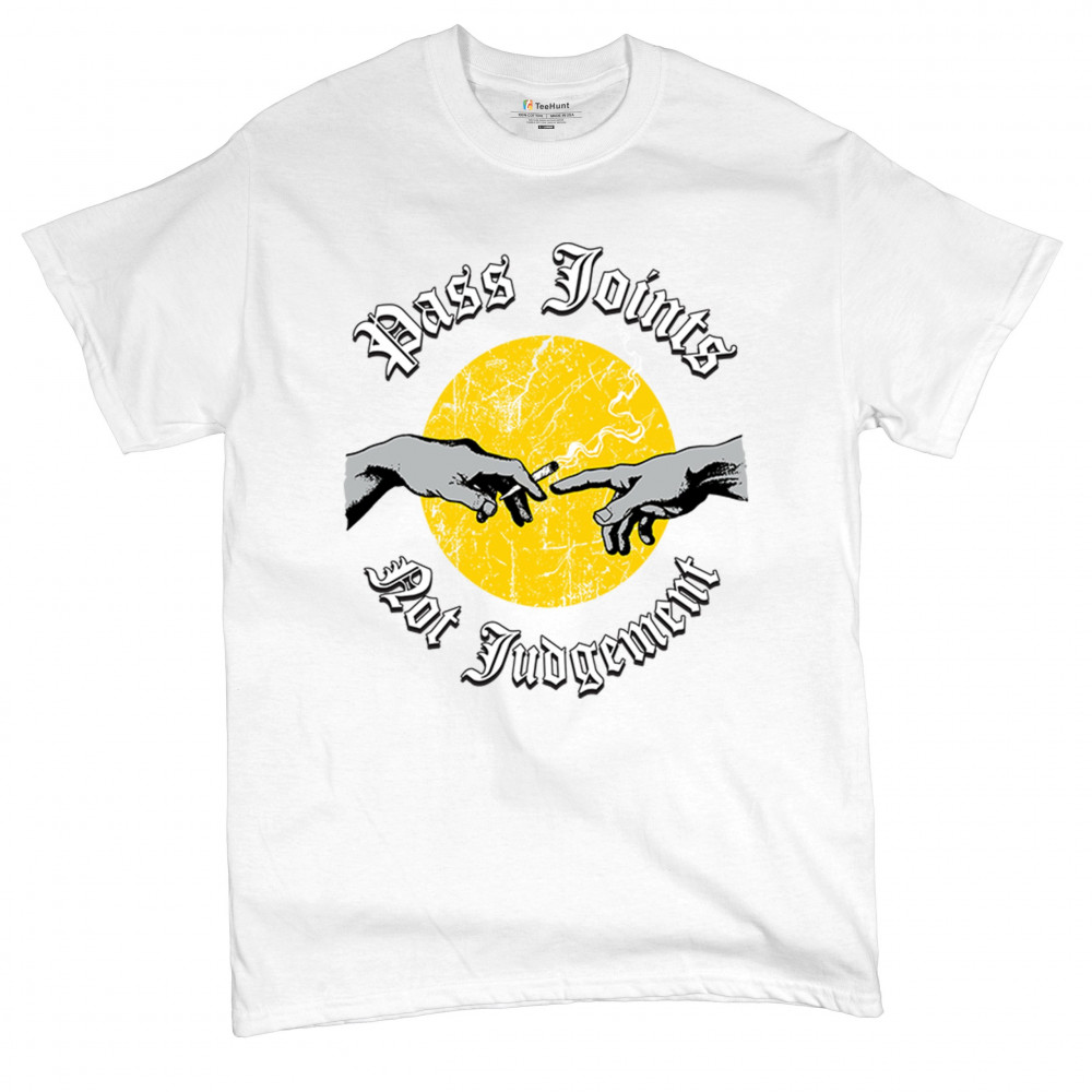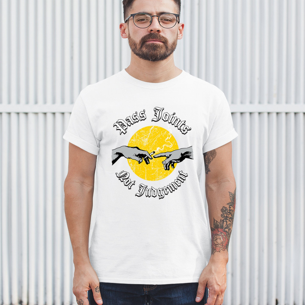 Cannabis culture twist on classic art. Hands passing a joint with “Pass Joints Not Judgement†message. Chill, bold, and unapologetically stoner.