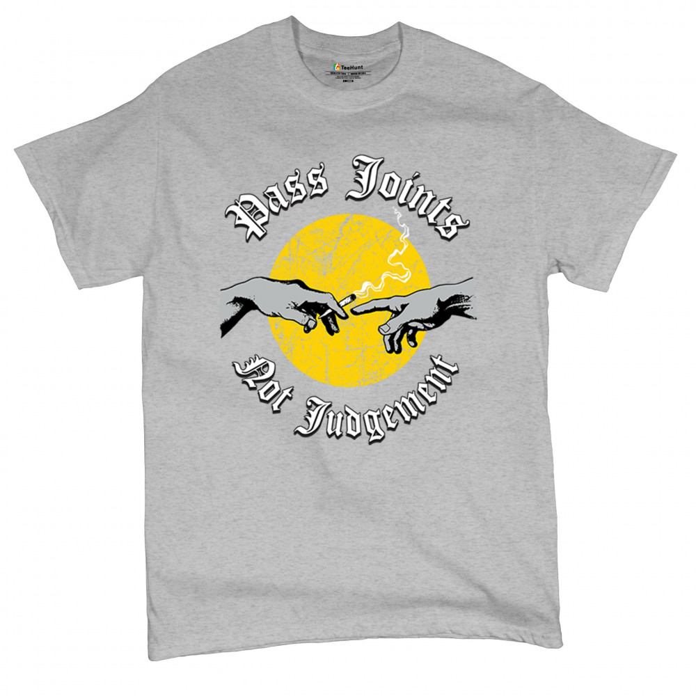 Cannabis culture twist on classic art. Hands passing a joint with “Pass Joints Not Judgement†message. Chill, bold, and unapologetically stoner.