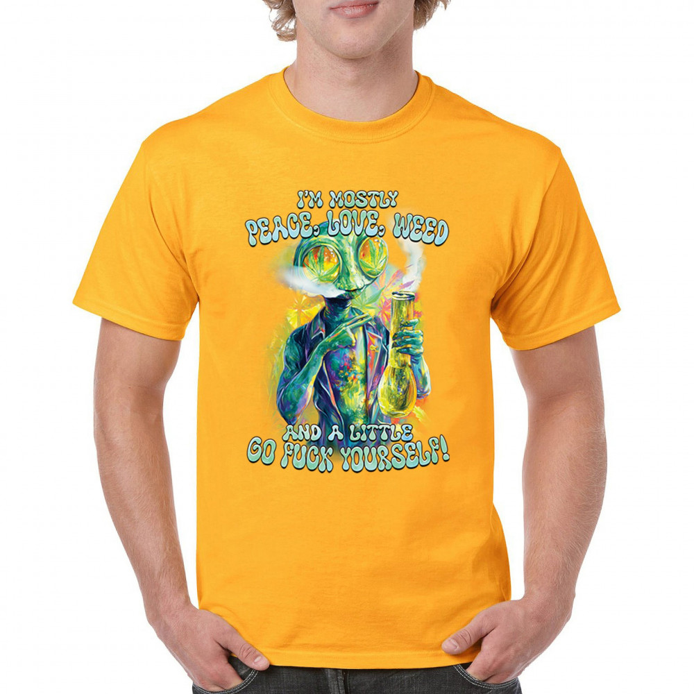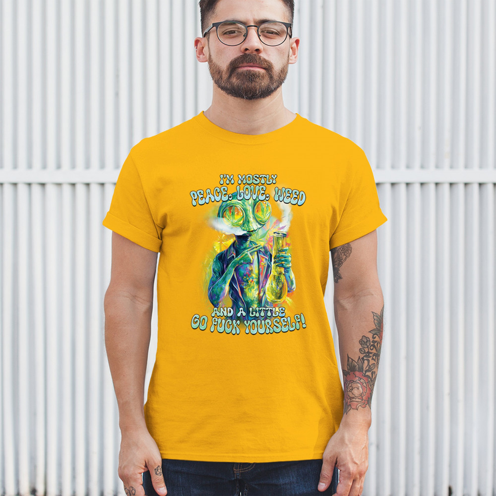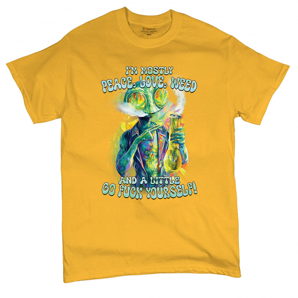 Bold alien cannabis design mixing humor, sarcasm, and weed culture—perfect for unapologetic smokers with attitude and peace vibes.