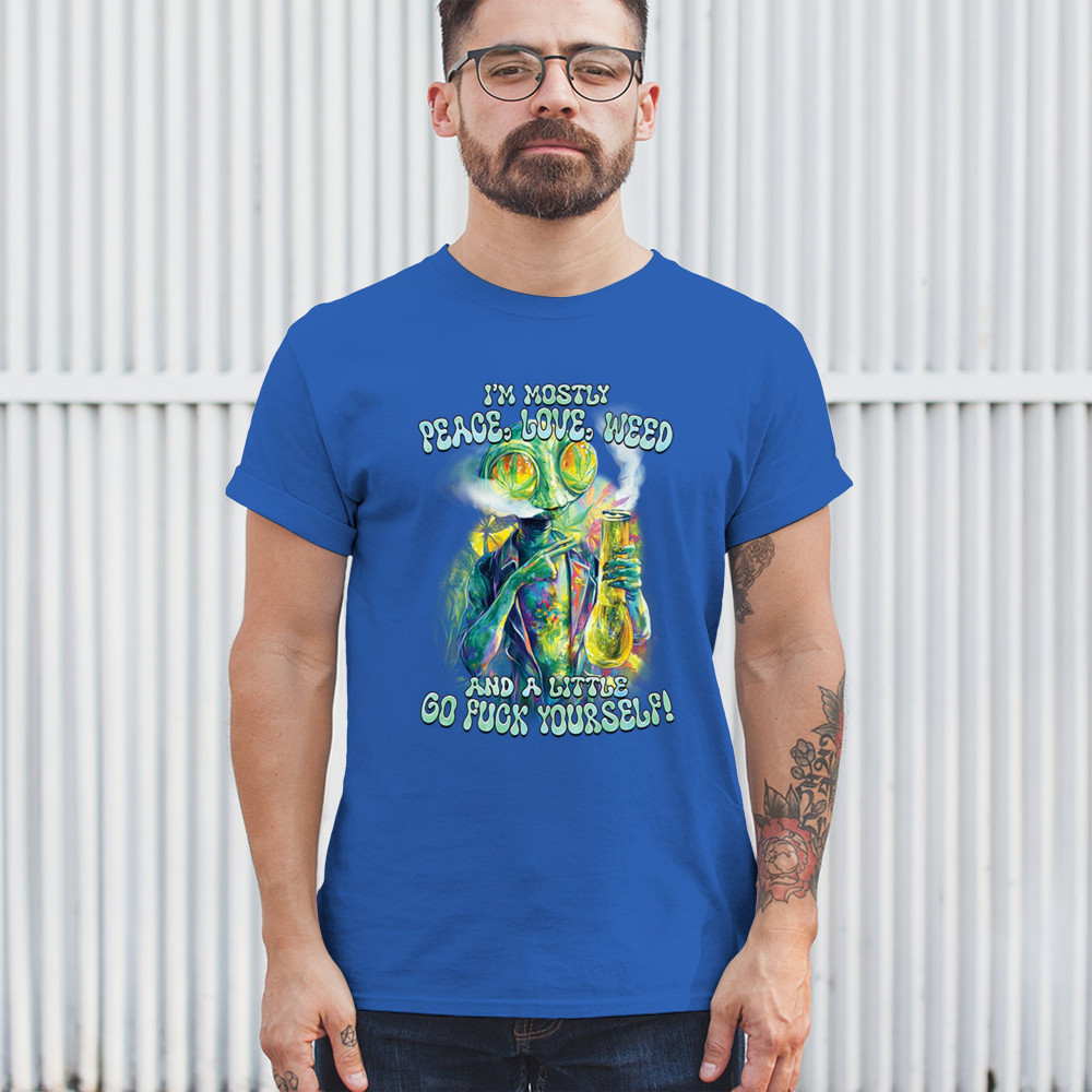 Bold alien cannabis design mixing humor, sarcasm, and weed culture—perfect for unapologetic smokers with attitude and peace vibes.