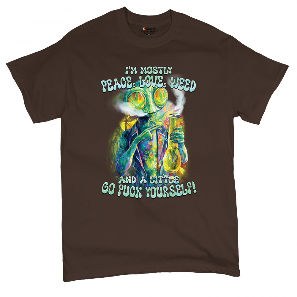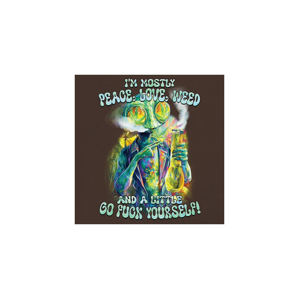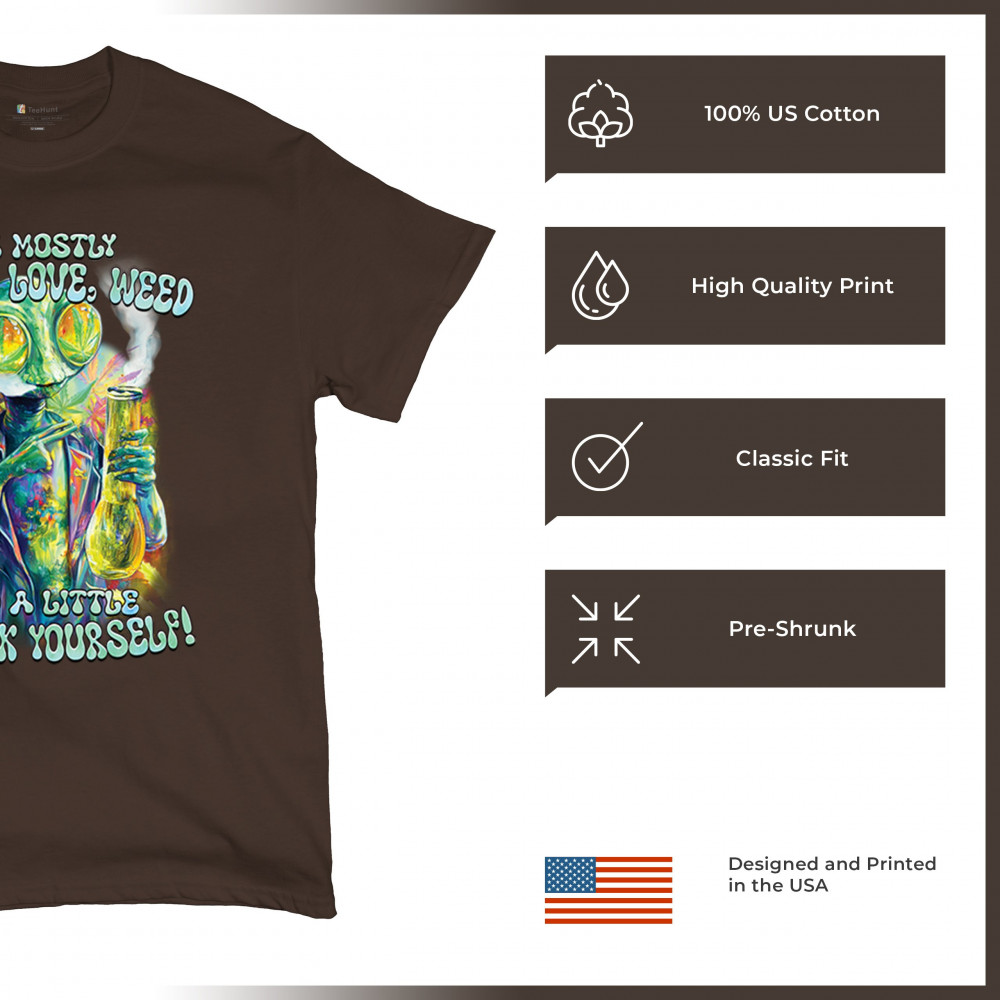 This bold alien stoner design fuses colorful weed art with raw honesty and stoner attitude. Featuring a high alien and vibrant peace love weed vibe, it's perfect for unapologetic smokers who blend kindness and truth. Wear it at festivals, smoke sessions, or whenever your mood is 80% peace, 20% sarcasm. It’s humor, cannabis culture, and bold energy rolled into one.