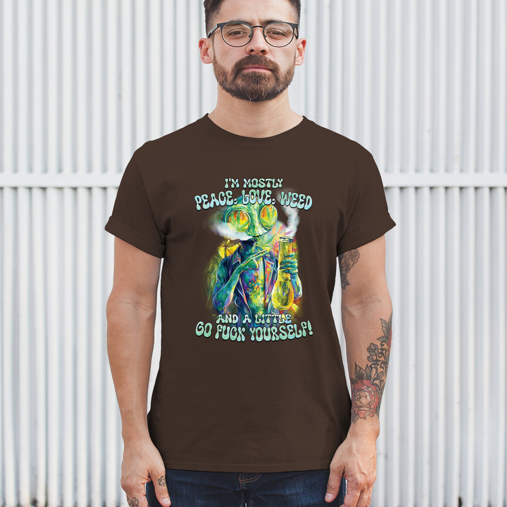 Bold alien cannabis design mixing humor, sarcasm, and weed culture—perfect for unapologetic smokers with attitude and peace vibes.