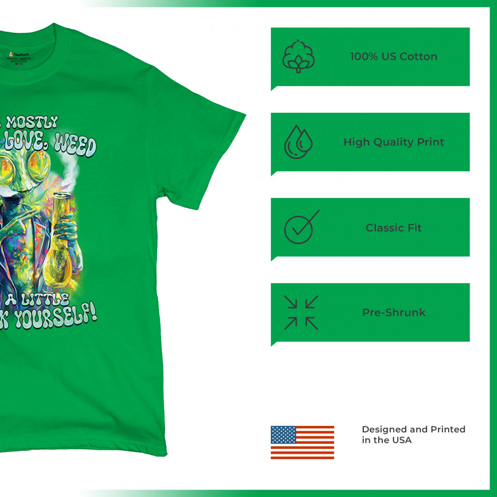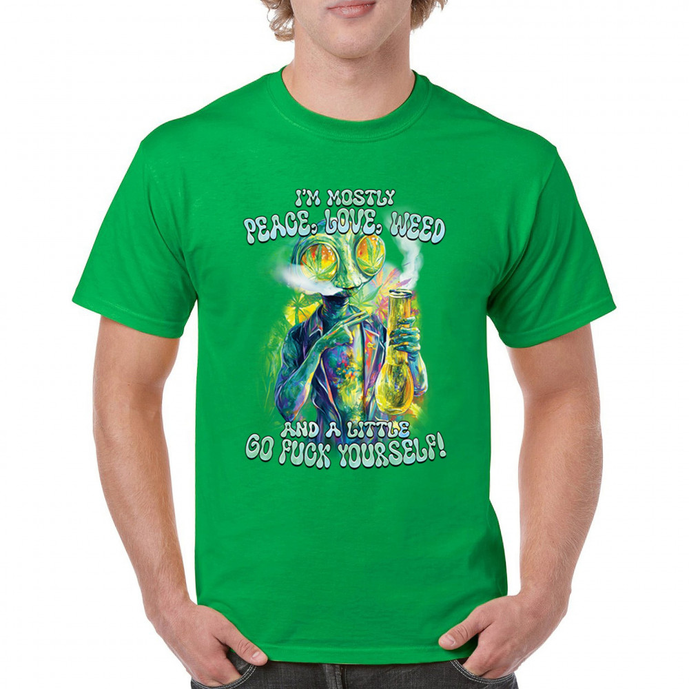 This bold alien stoner design fuses colorful weed art with raw honesty and stoner attitude. Featuring a high alien and vibrant peace love weed vibe, it's perfect for unapologetic smokers who blend kindness and truth. Wear it at festivals, smoke sessions, or whenever your mood is 80% peace, 20% sarcasm. It’s humor, cannabis culture, and bold energy rolled into one.