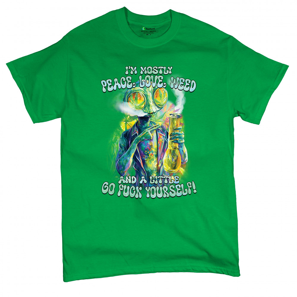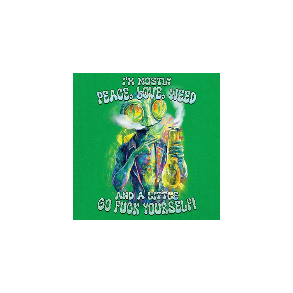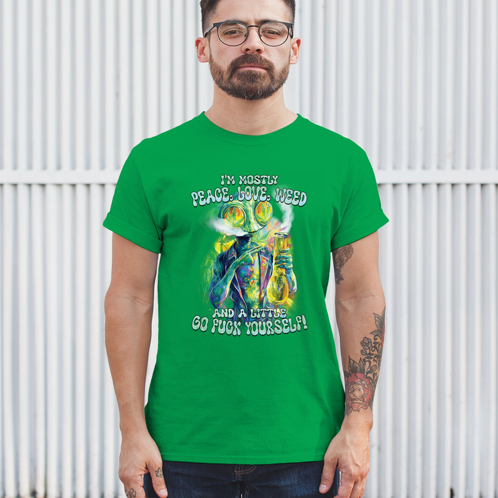 Bold alien cannabis design mixing humor, sarcasm, and weed culture—perfect for unapologetic smokers with attitude and peace vibes.