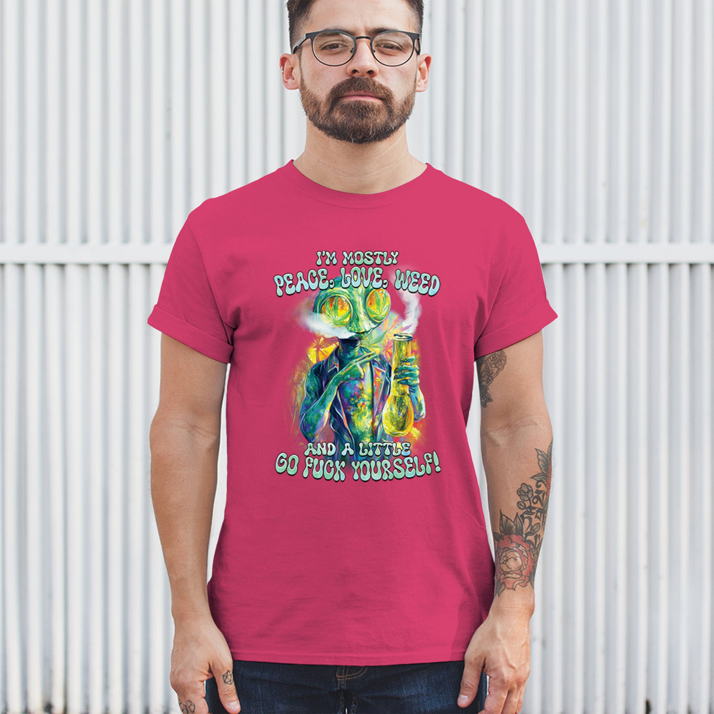 Bold alien cannabis design mixing humor, sarcasm, and weed culture—perfect for unapologetic smokers with attitude and peace vibes.