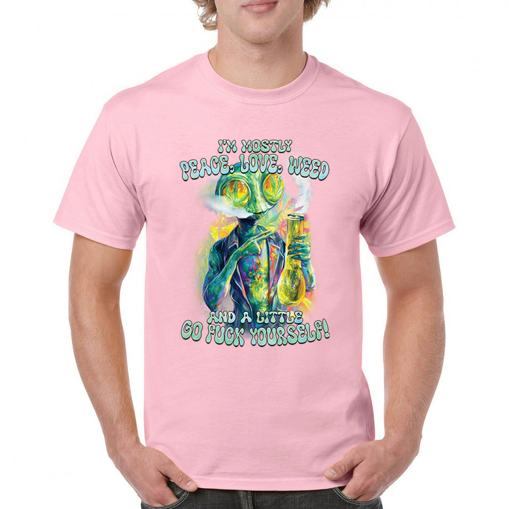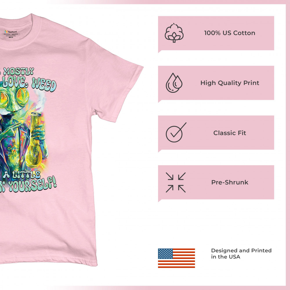 This bold alien stoner design fuses colorful weed art with raw honesty and stoner attitude. Featuring a high alien and vibrant peace love weed vibe, it's perfect for unapologetic smokers who blend kindness and truth. Wear it at festivals, smoke sessions, or whenever your mood is 80% peace, 20% sarcasm. It’s humor, cannabis culture, and bold energy rolled into one.