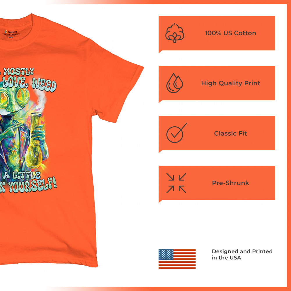 This bold alien stoner design fuses colorful weed art with raw honesty and stoner attitude. Featuring a high alien and vibrant peace love weed vibe, it's perfect for unapologetic smokers who blend kindness and truth. Wear it at festivals, smoke sessions, or whenever your mood is 80% peace, 20% sarcasm. It’s humor, cannabis culture, and bold energy rolled into one.