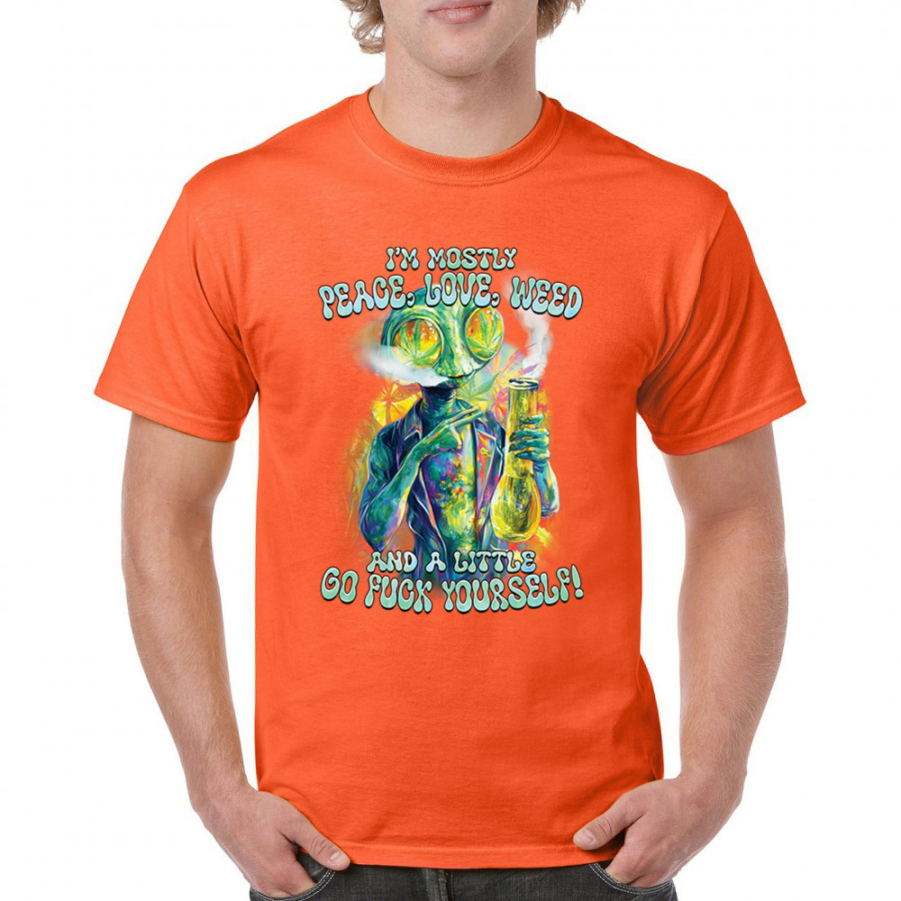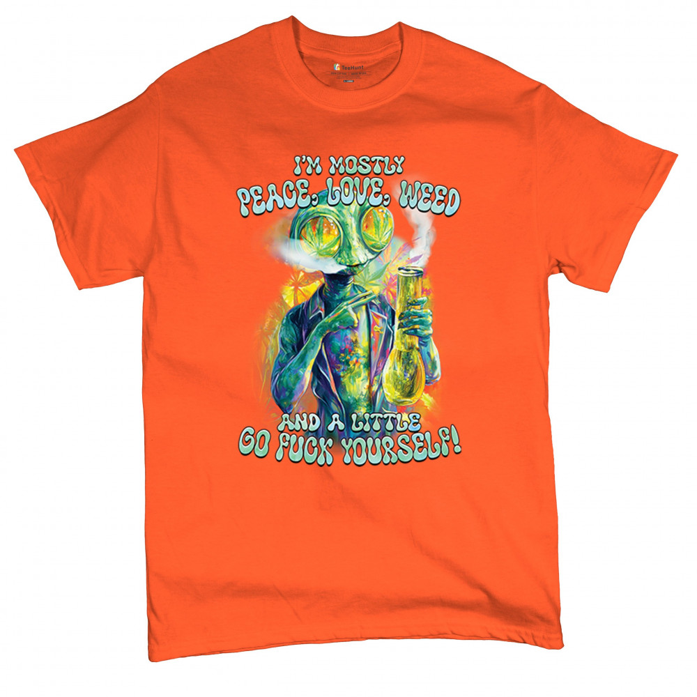 Bold alien cannabis design mixing humor, sarcasm, and weed culture—perfect for unapologetic smokers with attitude and peace vibes.