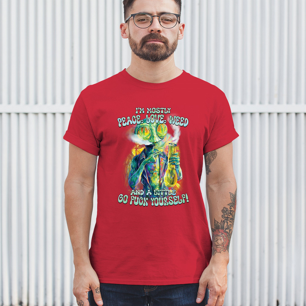Bold alien cannabis design mixing humor, sarcasm, and weed culture—perfect for unapologetic smokers with attitude and peace vibes.