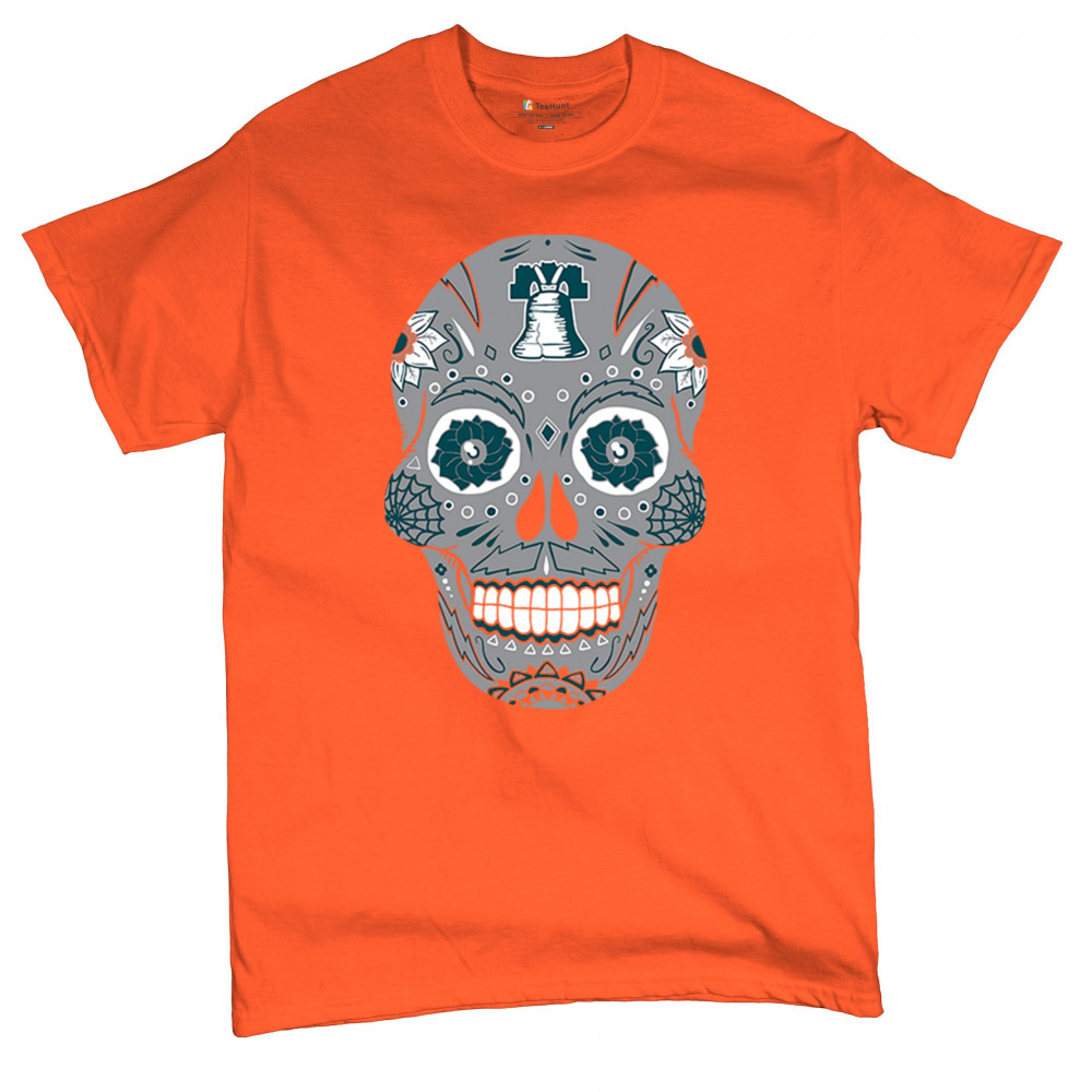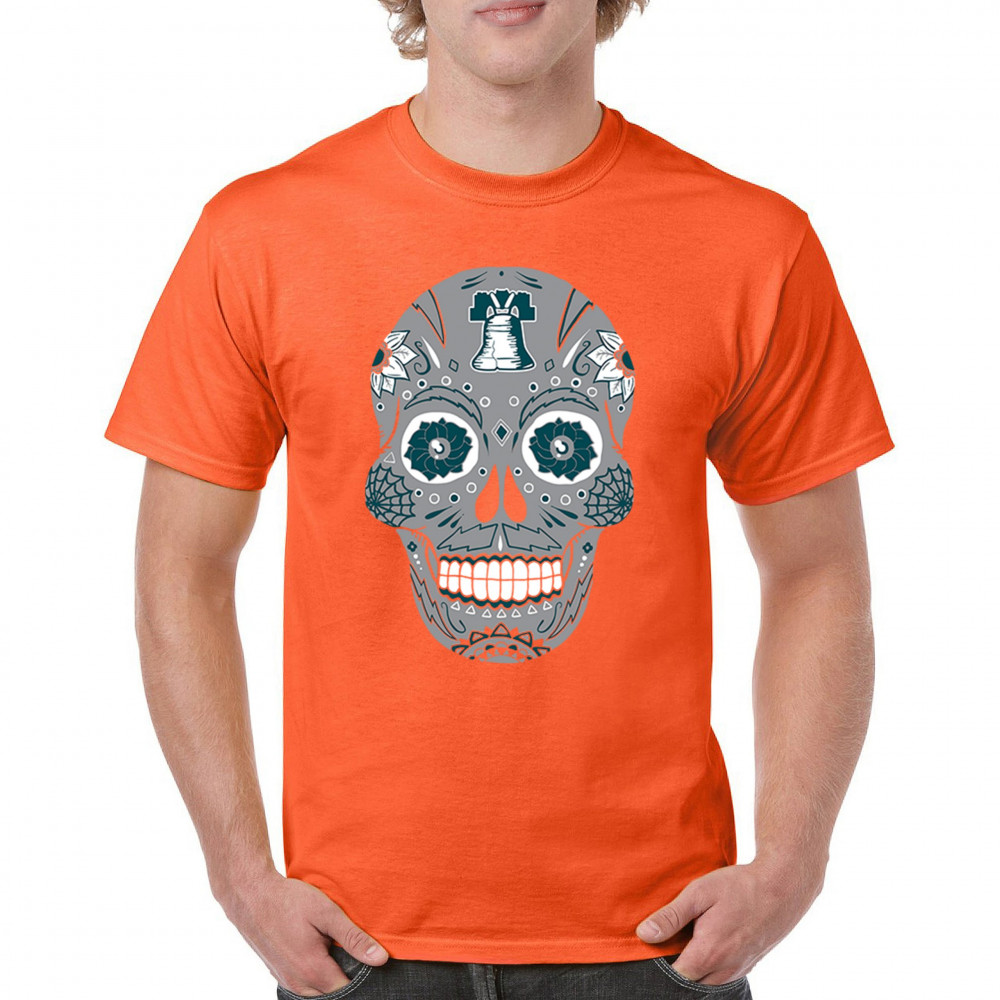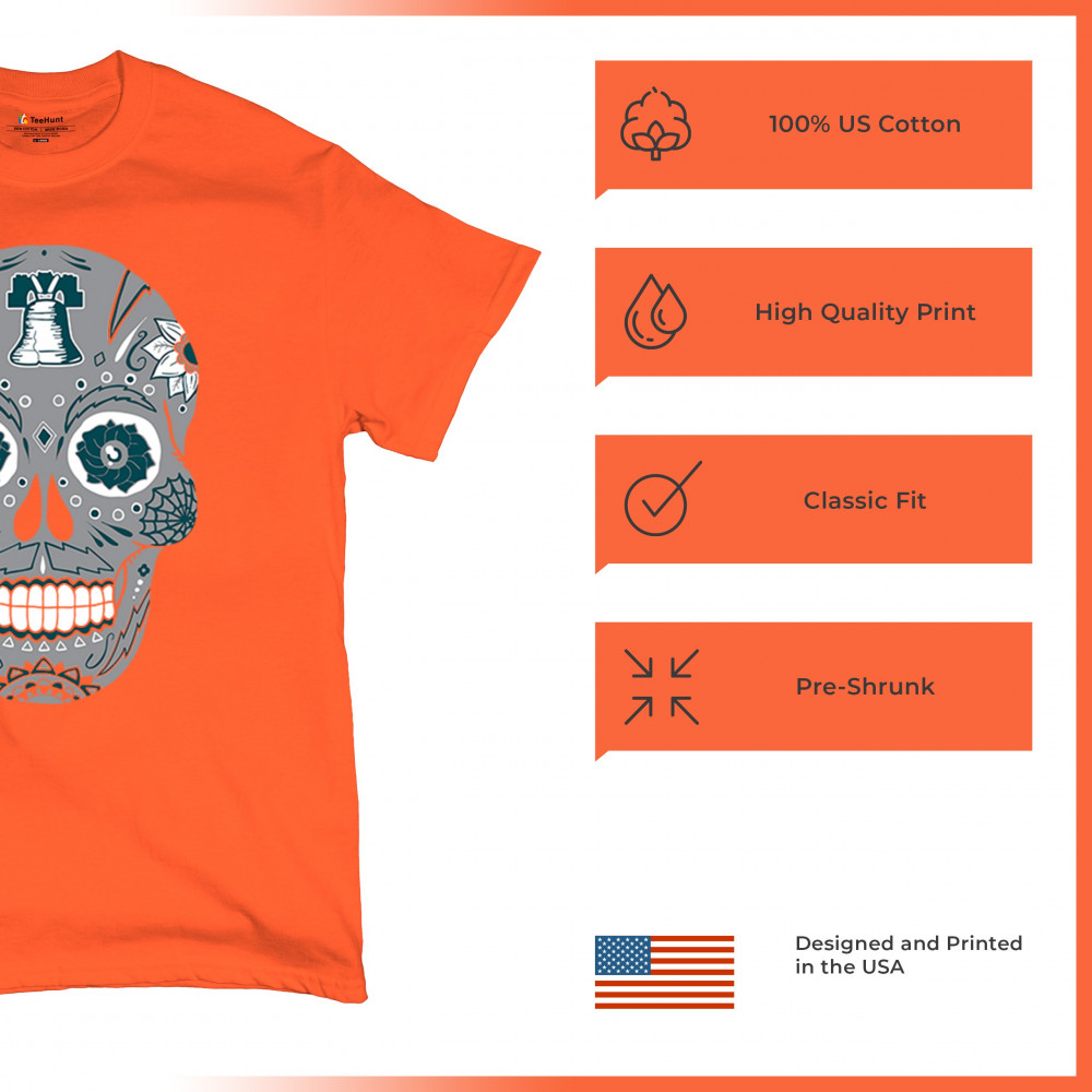Philly meets tradition in this Sugar Skull design, mixing calavera art with the iconic liberty bell and marigold flowers. Perfect for Philly sports culture, fantasy league energy, or game day skull vibes, it captures Philly gothic art and fan zone spirit. A unique way to honor Dia de los Muertos while showing local Philadelphia pride and heritage in bold style.