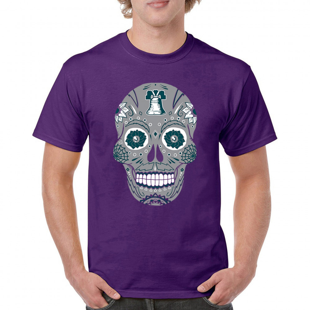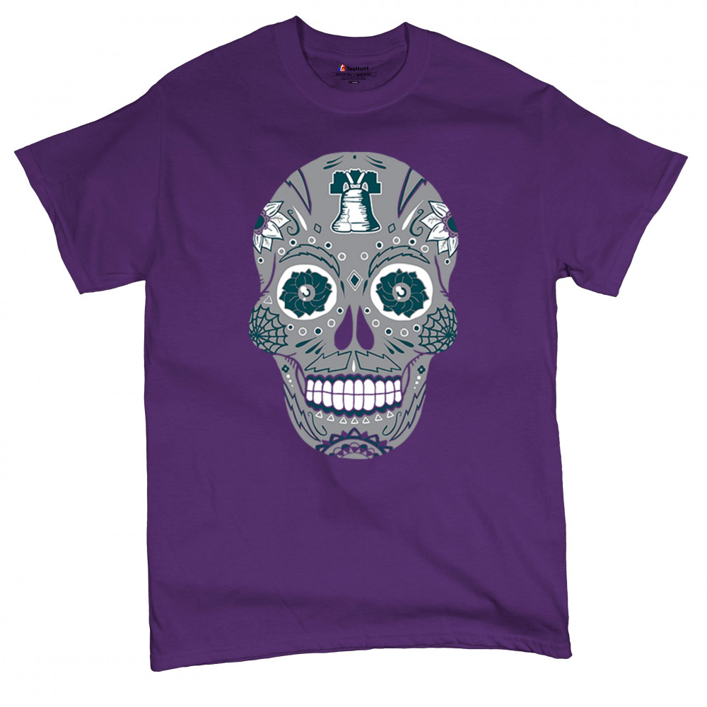 Philly meets tradition in this Sugar Skull design, mixing calavera art with the iconic liberty bell and marigold flowers. Perfect for Philly sports culture, fantasy league energy, or game day skull vibes, it captures Philly gothic art and fan zone spirit. A unique way to honor Dia de los Muertos while showing local Philadelphia pride and heritage in bold style.