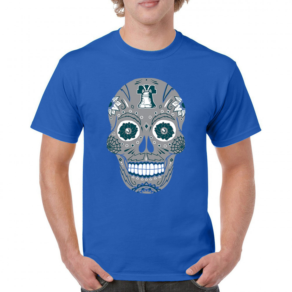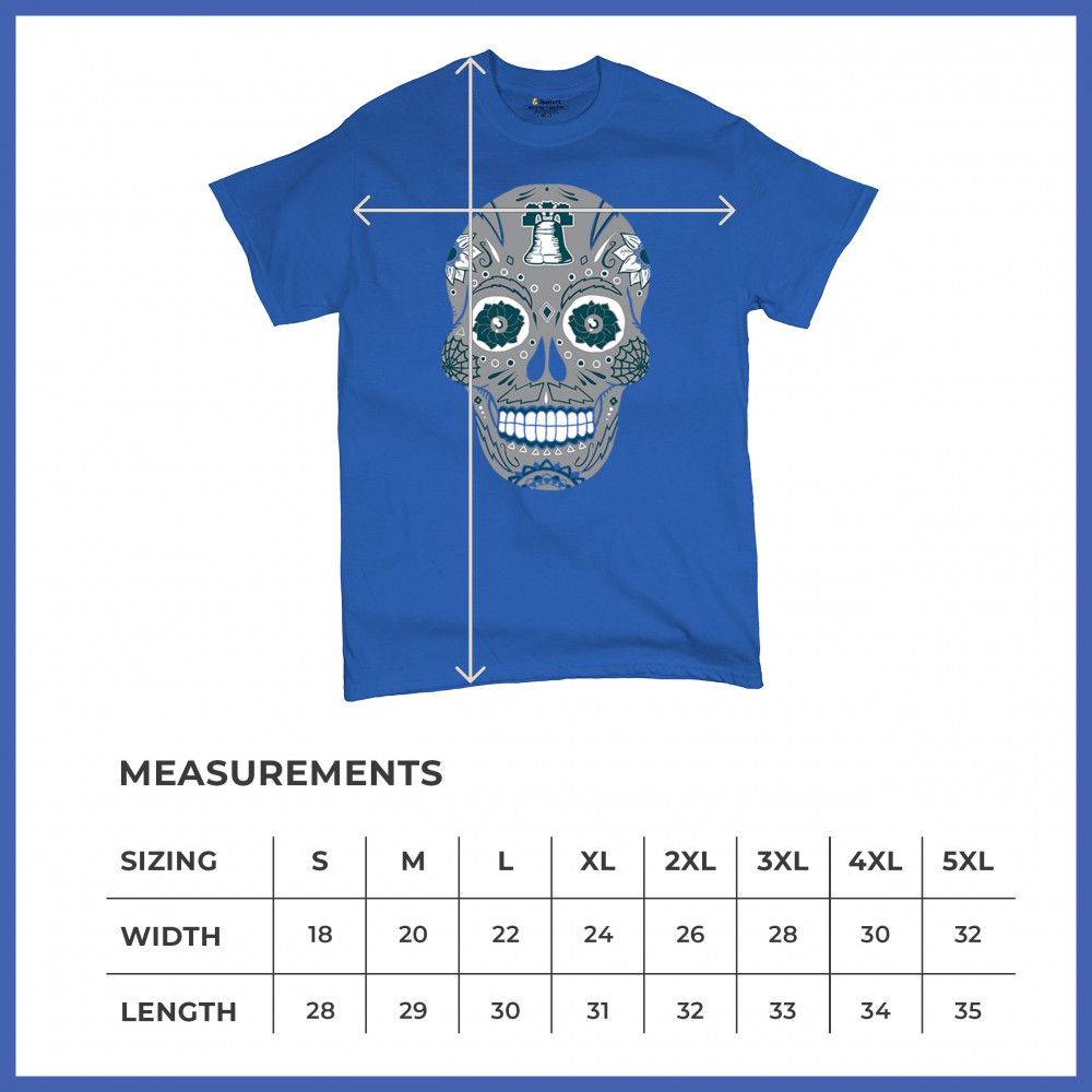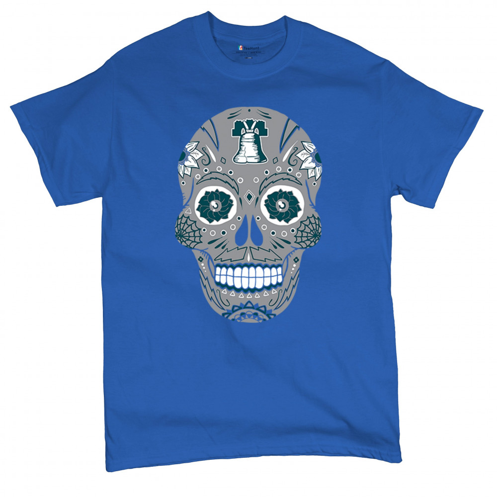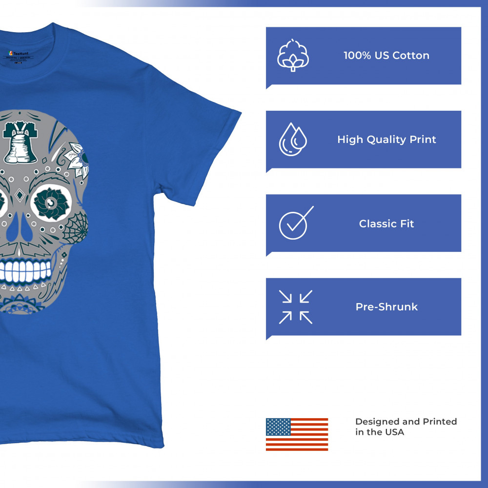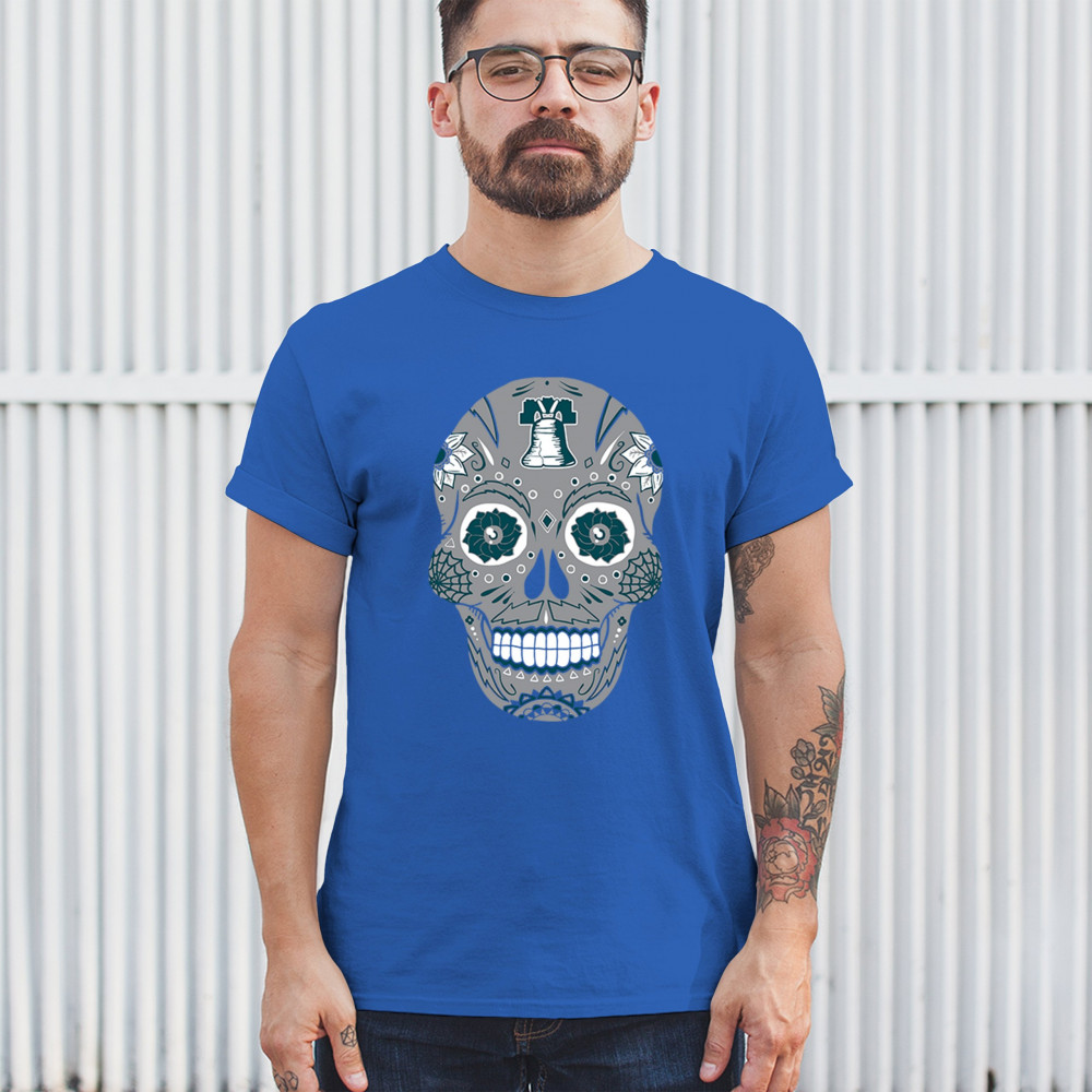 Philly meets tradition in this Sugar Skull design, mixing calavera art with the iconic liberty bell and marigold flowers. Perfect for Philly sports culture, fantasy league energy, or game day skull vibes, it captures Philly gothic art and fan zone spirit. A unique way to honor Dia de los Muertos while showing local Philadelphia pride and heritage in bold style.