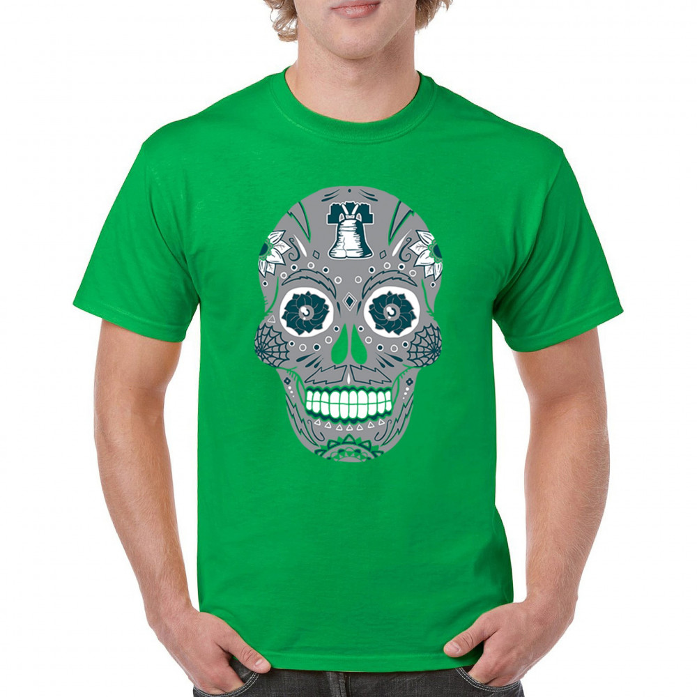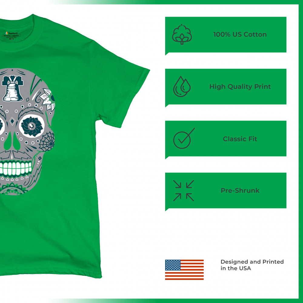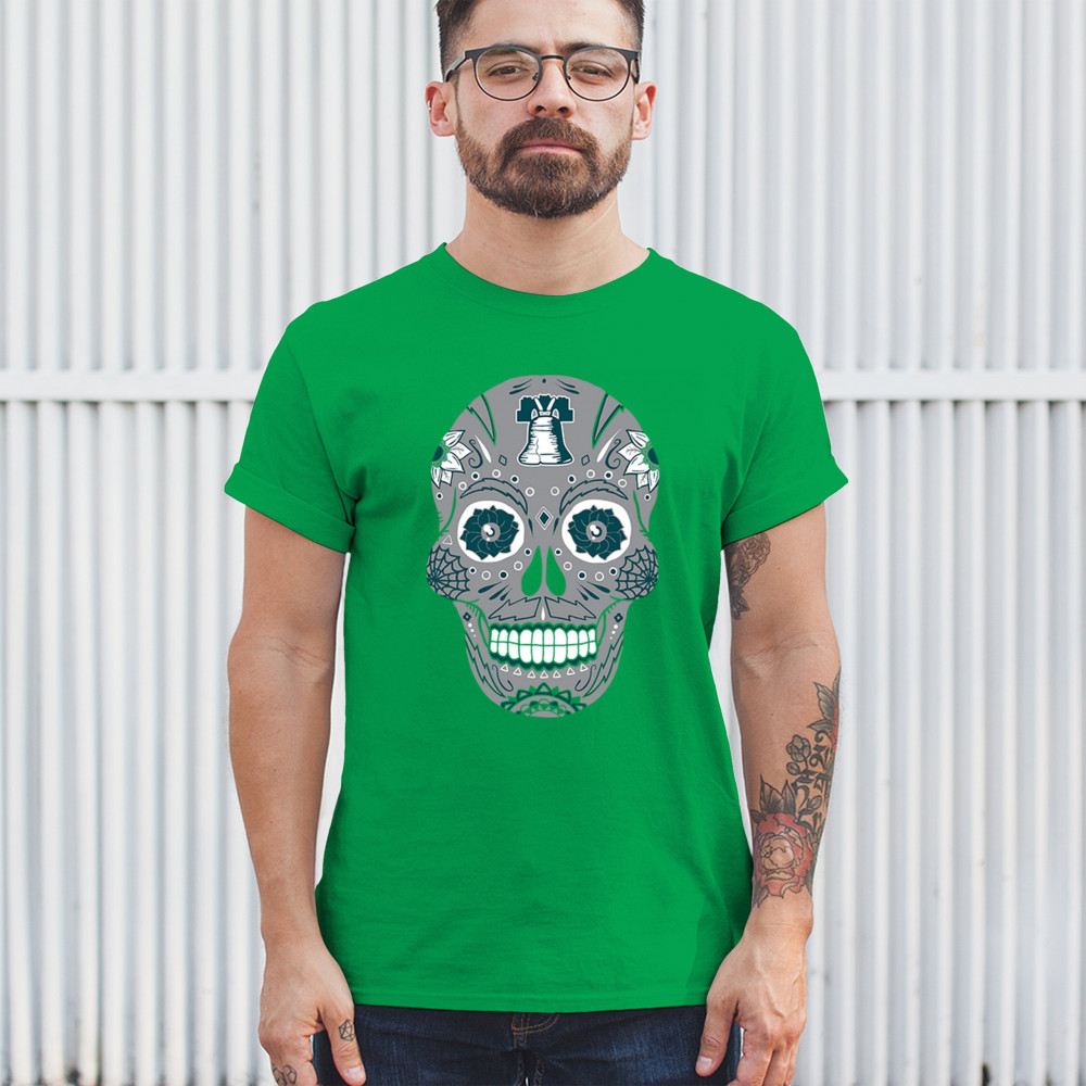 Philly meets tradition in this Sugar Skull design, mixing calavera art with the iconic liberty bell and marigold flowers. Perfect for Philly sports culture, fantasy league energy, or game day skull vibes, it captures Philly gothic art and fan zone spirit. A unique way to honor Dia de los Muertos while showing local Philadelphia pride and heritage in bold style.