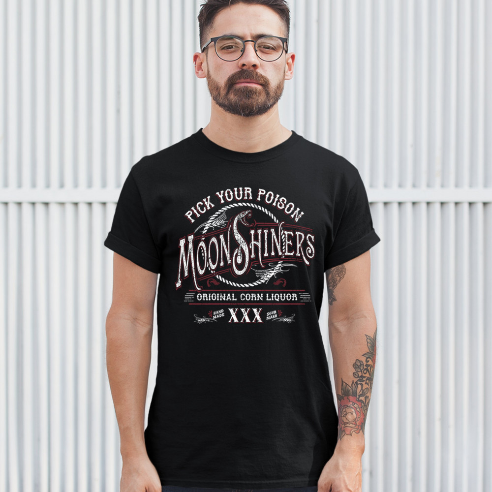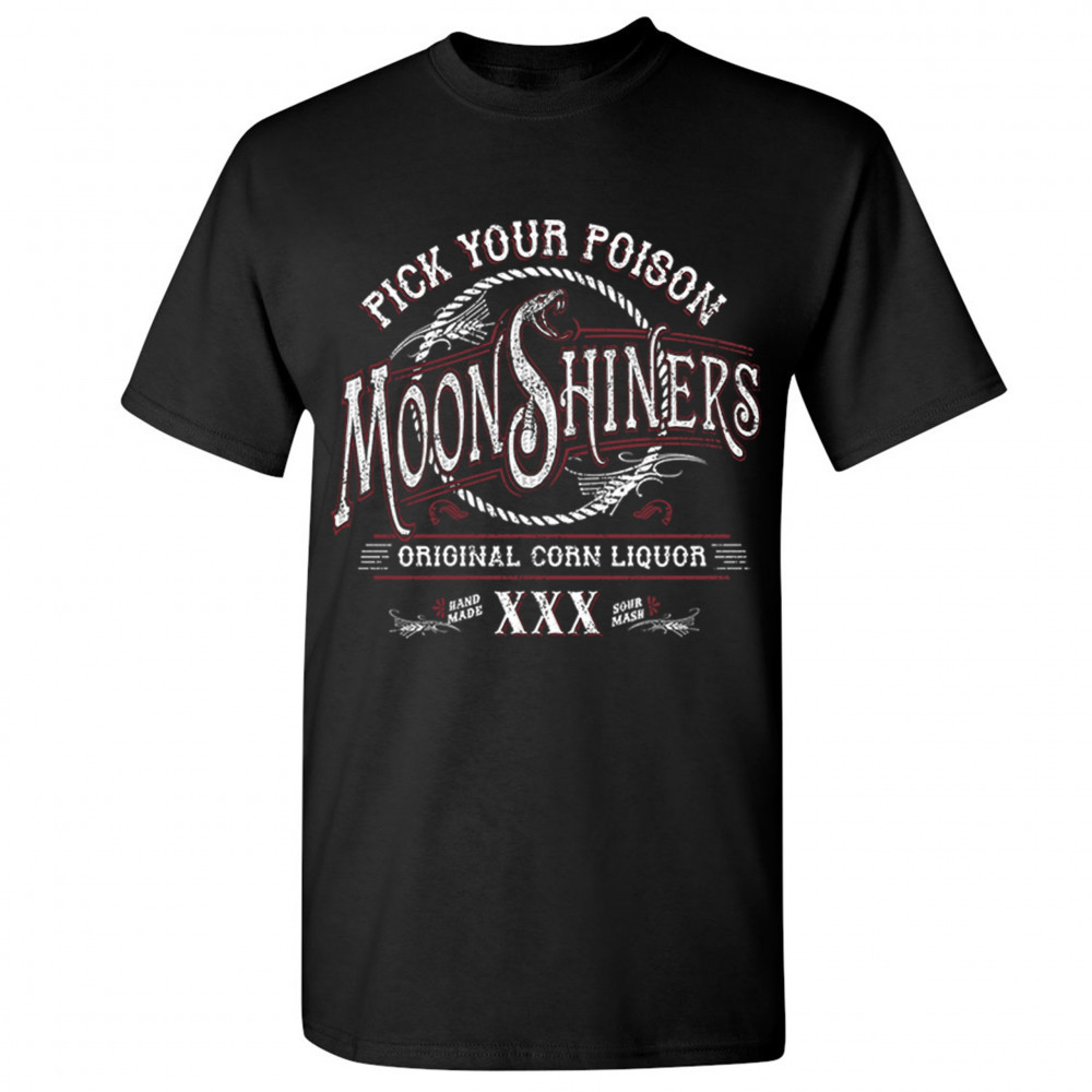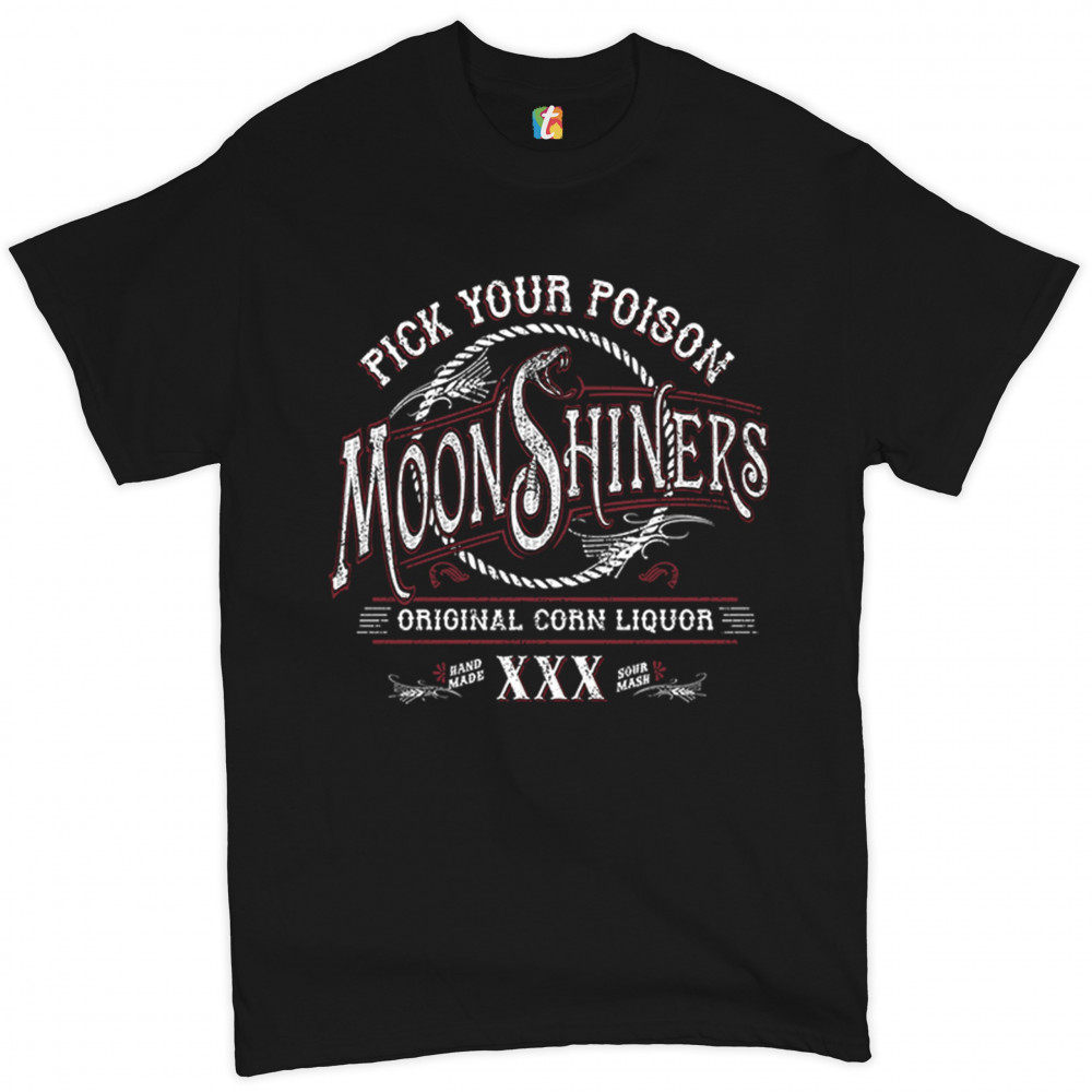 PICK YOUR POISON MOONSHINERS t-shirt original corn liquor xxx men's tee black