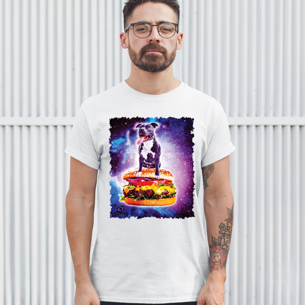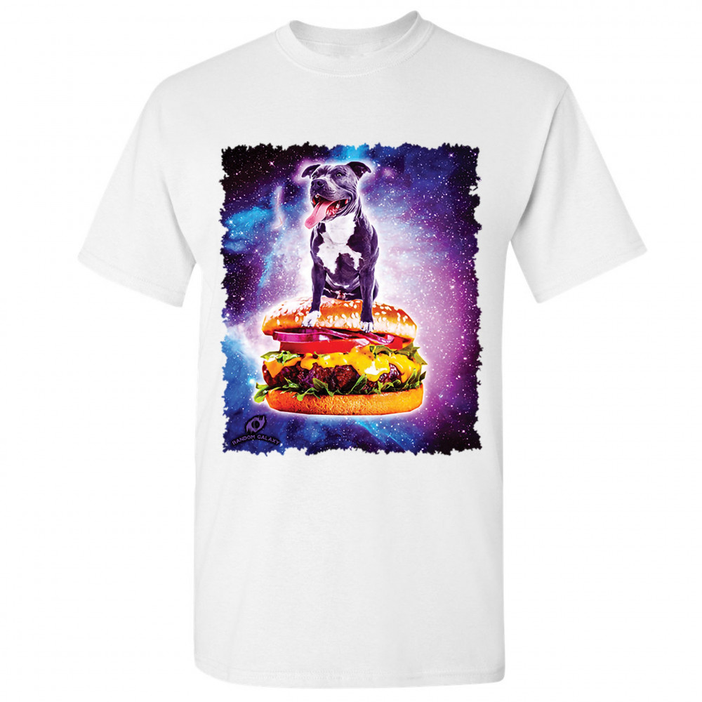 PIT BULL RIDING A BURGER FLYING THROUGH GALAXY t-shirt funny pet men's tee white