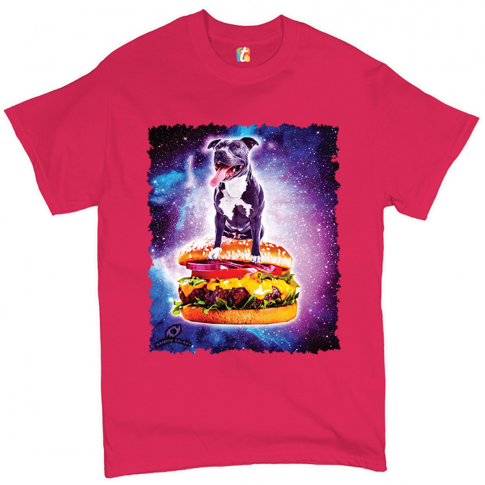 PIT BULL RIDING A BURGER FLYING THROUGH GALAXY t-shirt funny pet men's tee hot pink