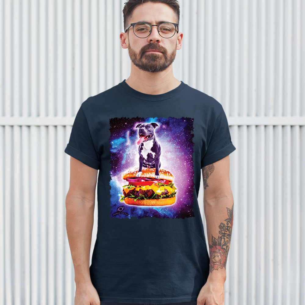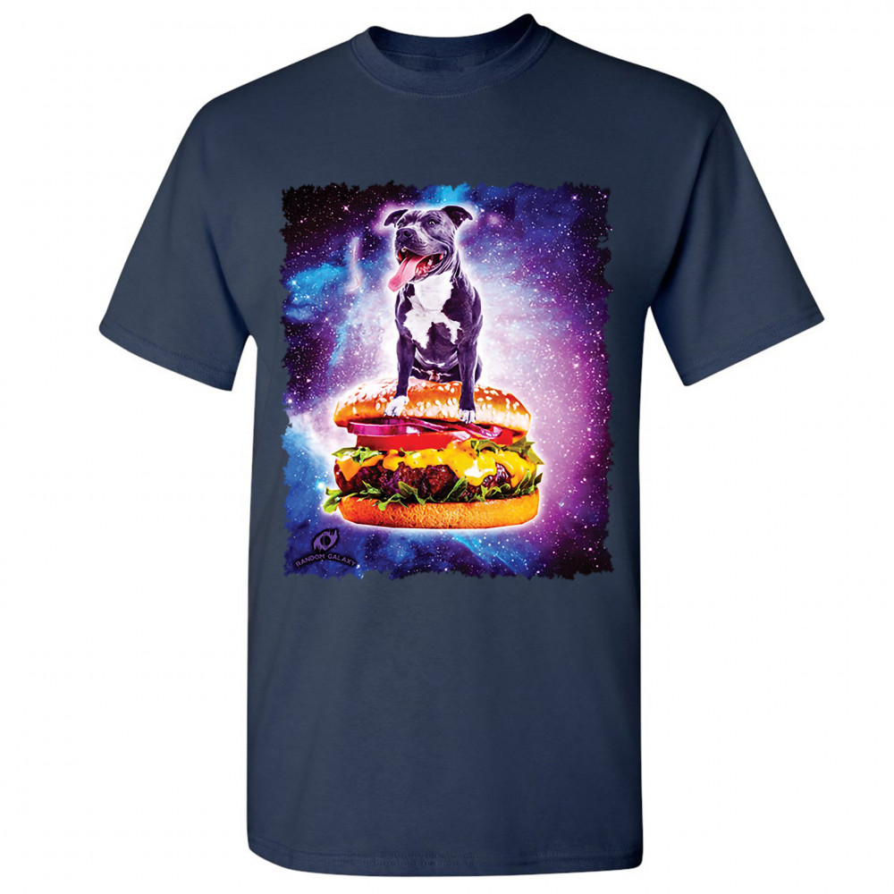 PIT BULL RIDING A BURGER FLYING THROUGH GALAXY t-shirt funny pet men's tee navy blue