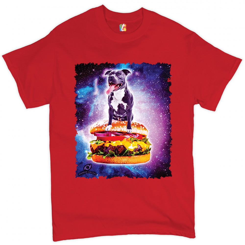 PIT BULL RIDING A BURGER FLYING THROUGH GALAXY t-shirt funny pet men's tee red