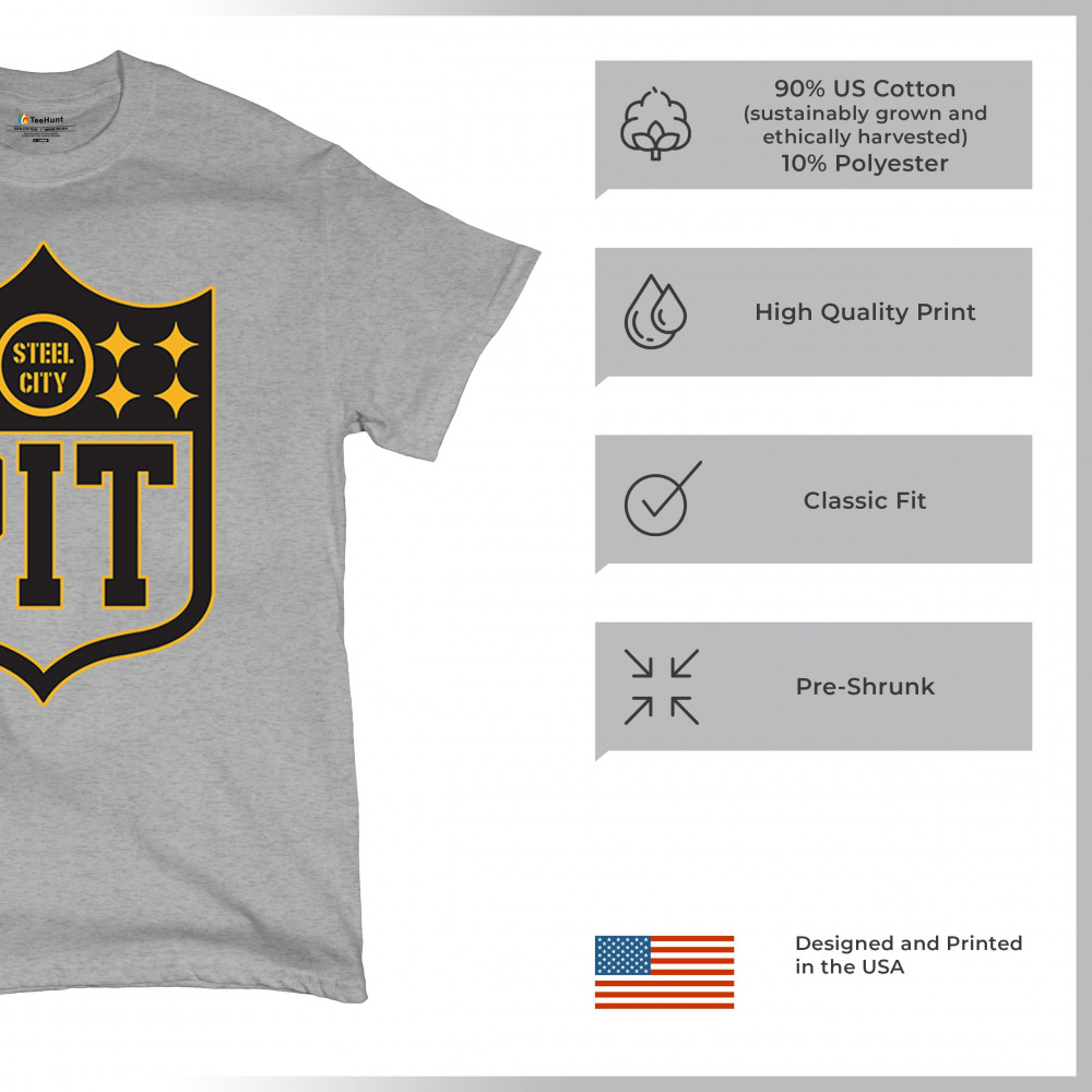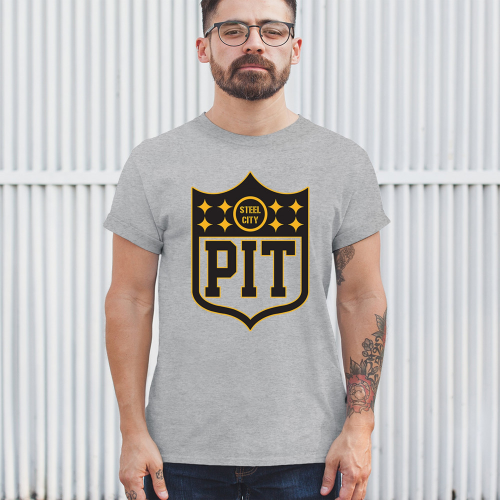 Steel City PIT shield football gear celebrating Pittsburgh football nation, gridiron tradition, playoff vibes, and sports heritage.