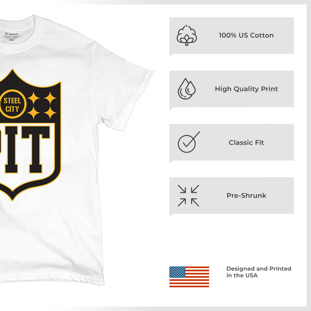 Steel City PIT shield football gear celebrating Pittsburgh football nation, gridiron tradition, playoff vibes, and sports heritage.