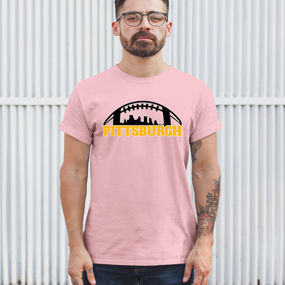 Embrace your Steel City pride with this bold Pittsburgh-themed design, showcasing the city skyline in a unique football graphic. Perfect for game day celebrations, tailgating parties, or everyday wear, this design captures the energy and passion of Pittsburgh's legendary sports culture. Whether you're cheering on your favorite team or representing your city, this design is a must-have for Pittsburgh fans.