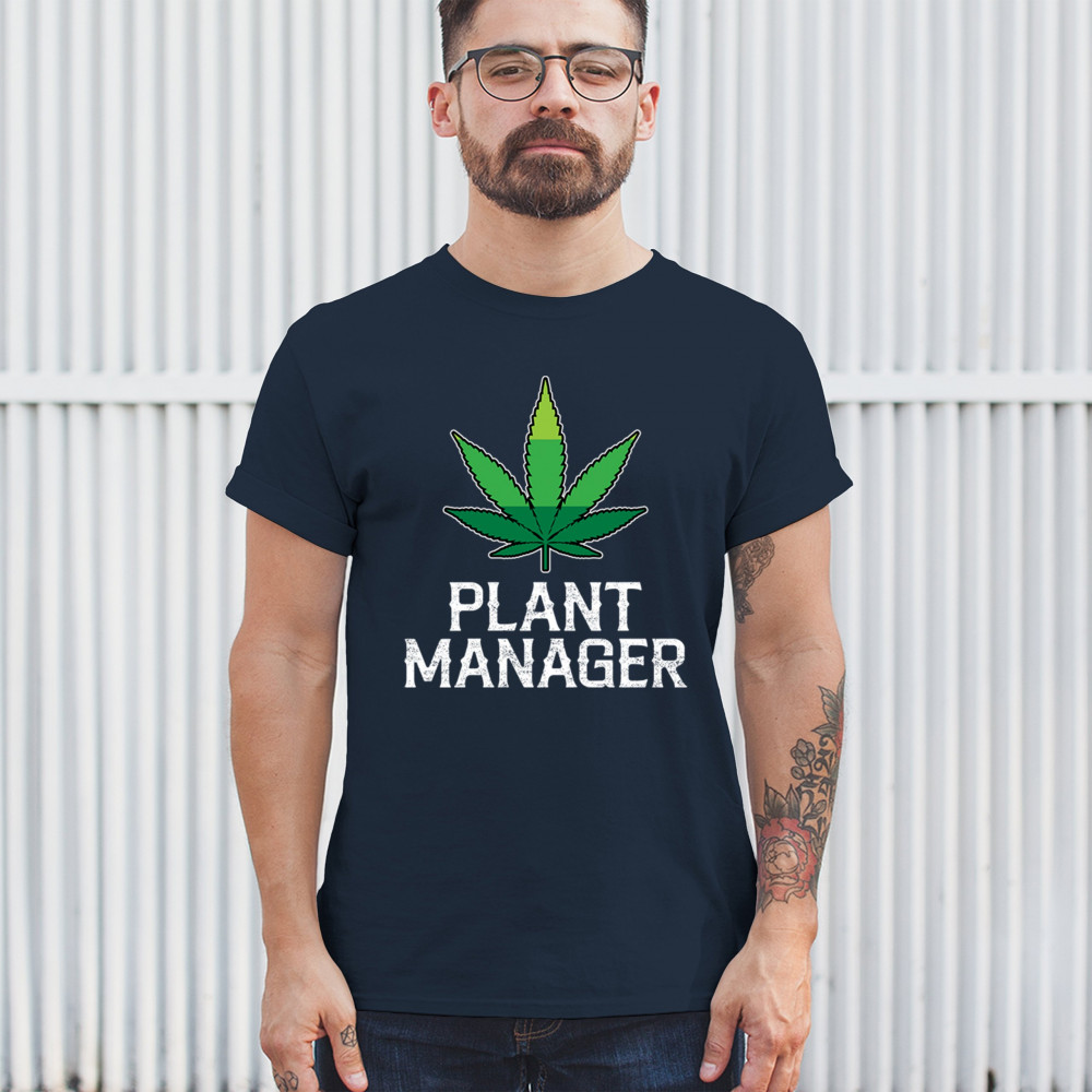 Humorous "Plant Manager" design featuring a bold green cannabis leaf. Perfect for fans of Mary Jane, stoned humor, and relaxed style. Ideal for chill vibes.