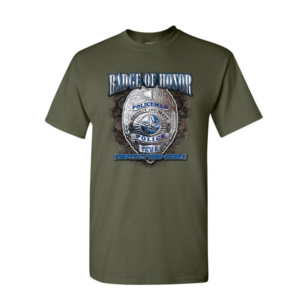 POLICEMAN BADGE OF HONOR t-shirt police protect and serve cop pd mens tee shirt military green