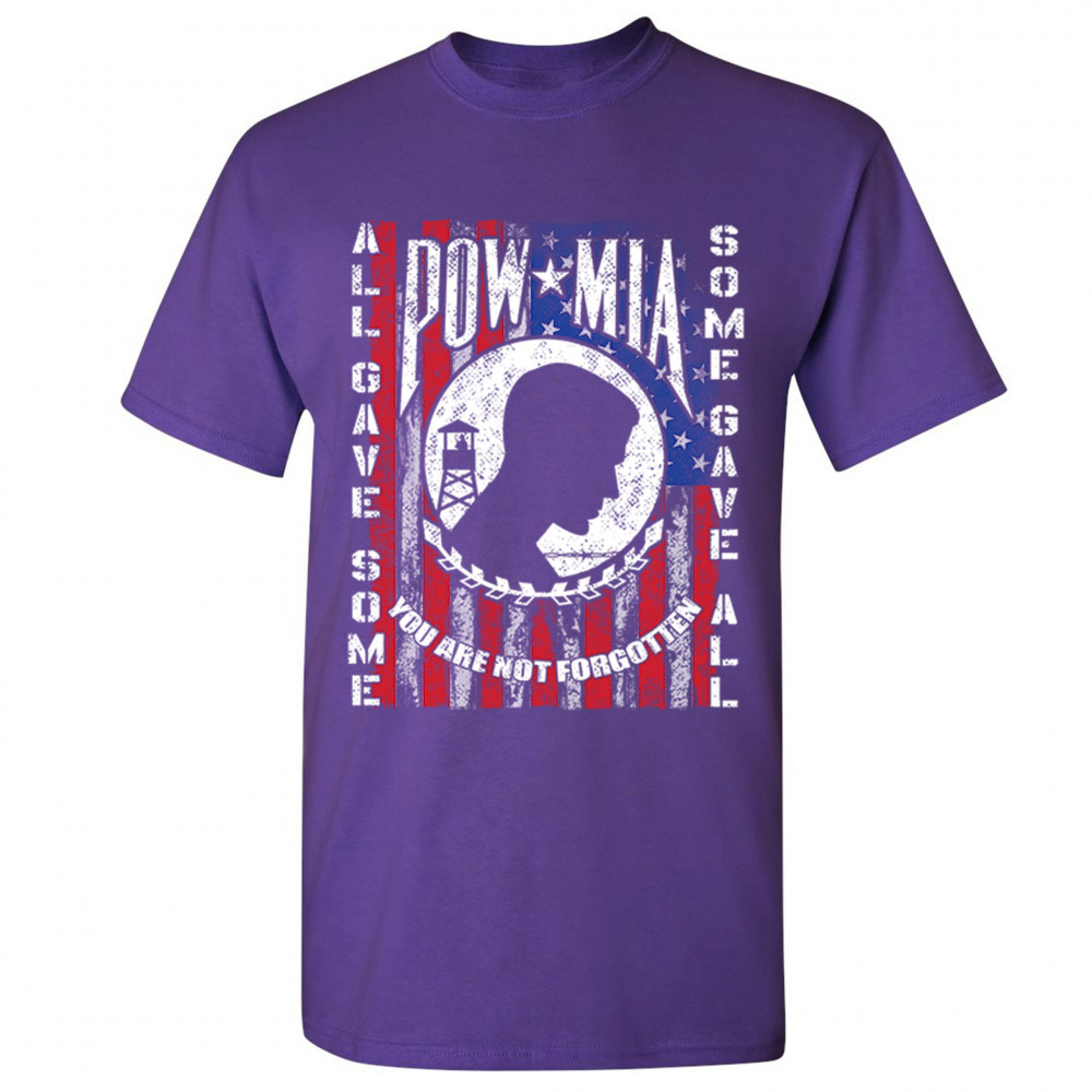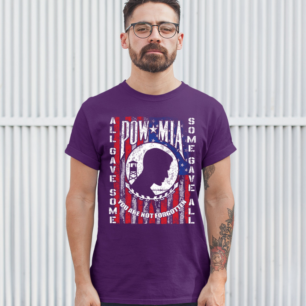 A patriotic print featuring the combination of the National League of Families' POW/MIA flag with a distressed American flag. On the sides of the flag it features the phrase: "All Gave Some, Some Gave All". Great choice to wear on Patriot's Day, Memorial