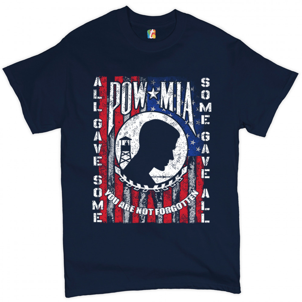 A patriotic print featuring the combination of the National League of Families' POW/MIA flag with a distressed American flag. On the sides of the flag it features the phrase: "All Gave Some, Some Gave All". Great choice to wear on Patriot's Day, Memorial