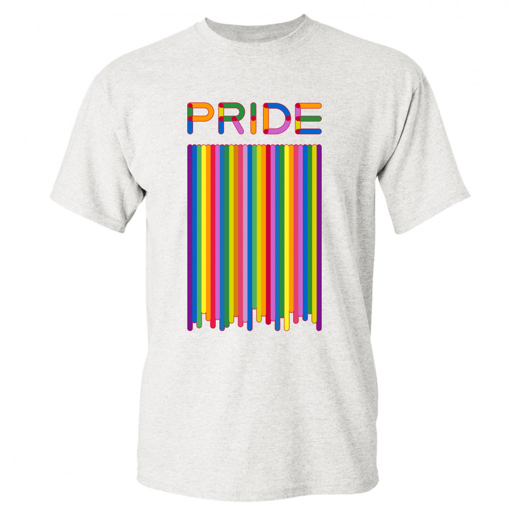 A print featuring a vertical flag painted in the colors of rainbow above which it says "Pride". Great choice to wear as a proud queer person.