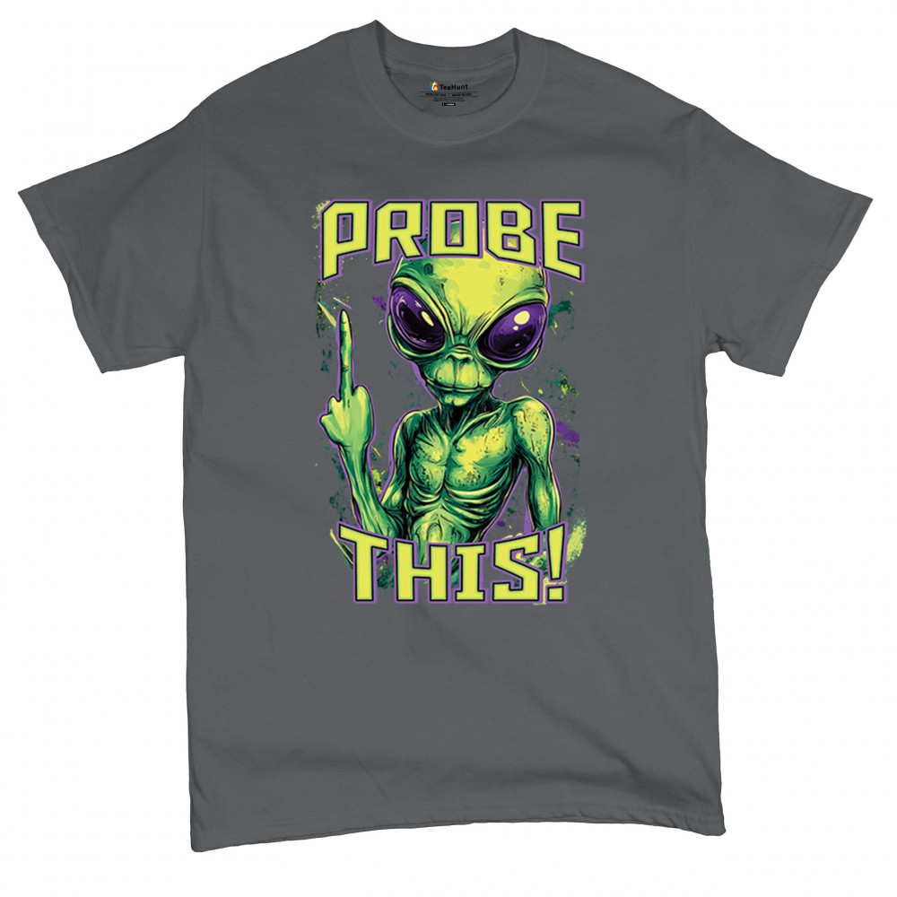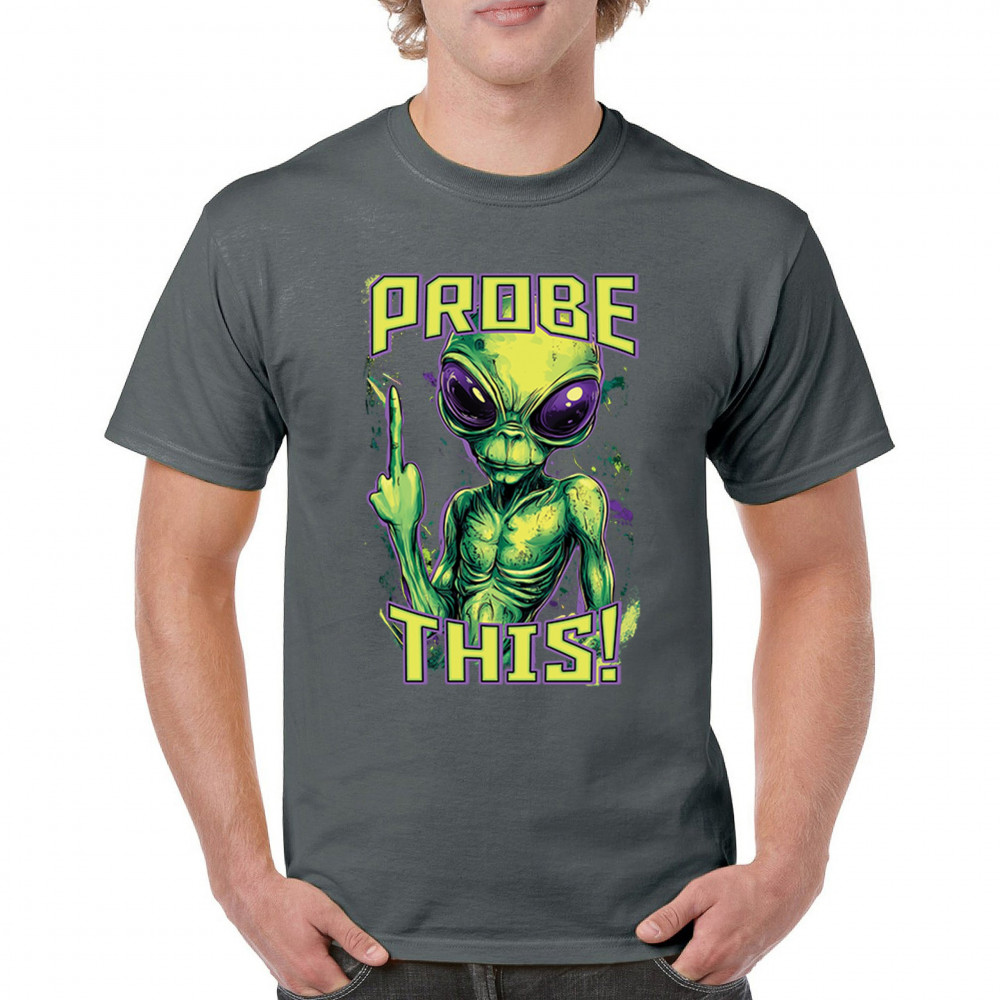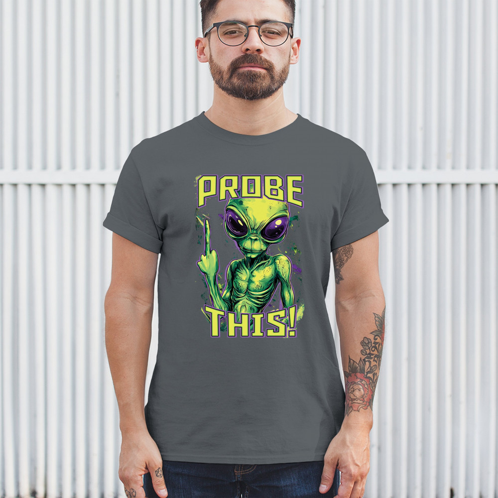Alien attitude goes full throttle in this rebellious design featuring a defiant extraterrestrial flipping the bird. Bold green and purple tones amplify the sarcasm, making it perfect for UFO fans, protest vibes, and anyone with a dark sense of humor. Wear it loud to alien fests, parties, or anytime you want to stir the stars.