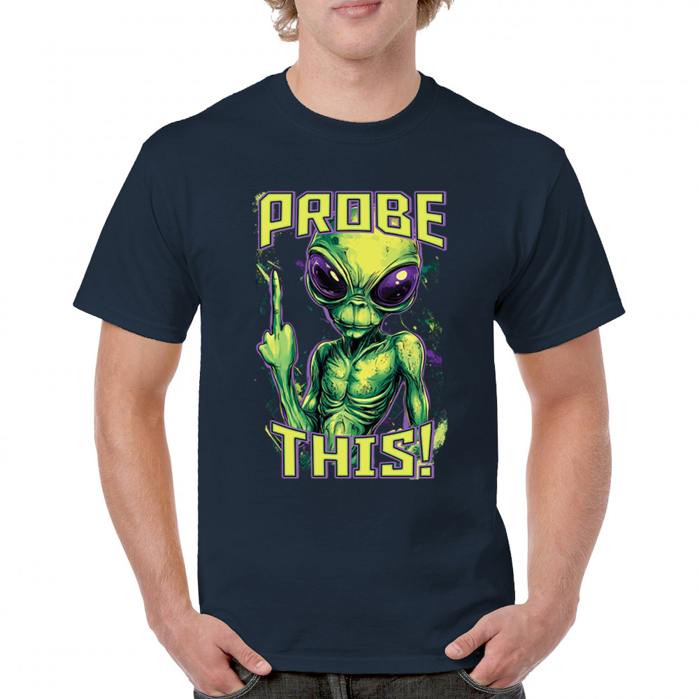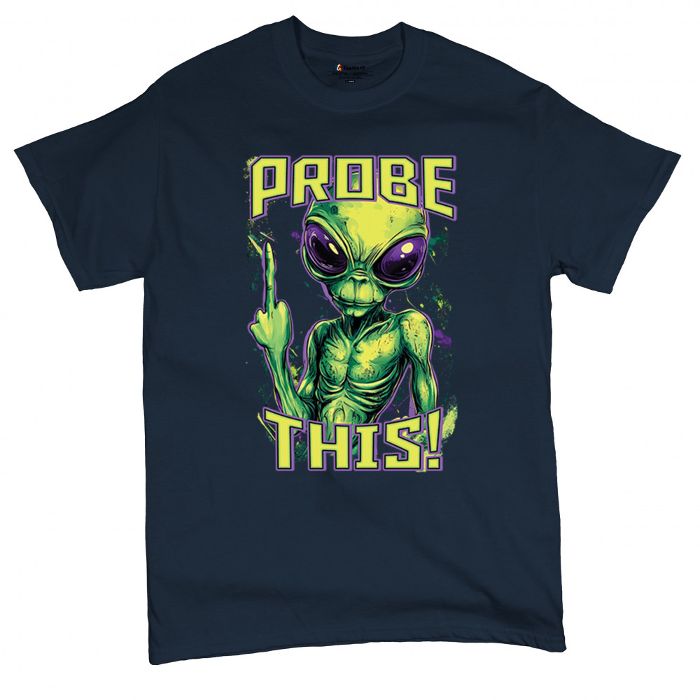 Alien attitude goes full throttle in this rebellious design featuring a defiant extraterrestrial flipping the bird. Bold green and purple tones amplify the sarcasm, making it perfect for UFO fans, protest vibes, and anyone with a dark sense of humor. Wear it loud to alien fests, parties, or anytime you want to stir the stars.