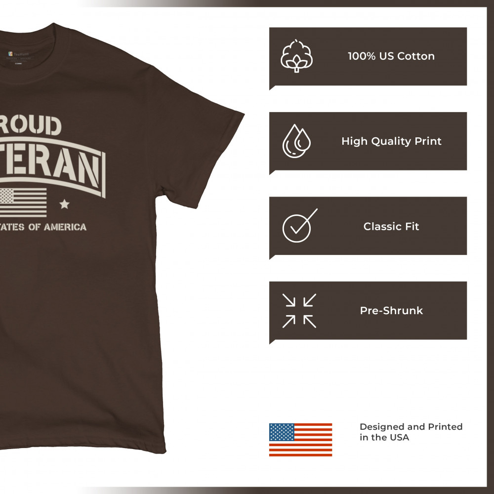 "Proud Veteran" shirt featuring bold design and American flag. Perfect for Memorial Day, Veterans Day, and everyday patriotism. High-quality and comfortable.