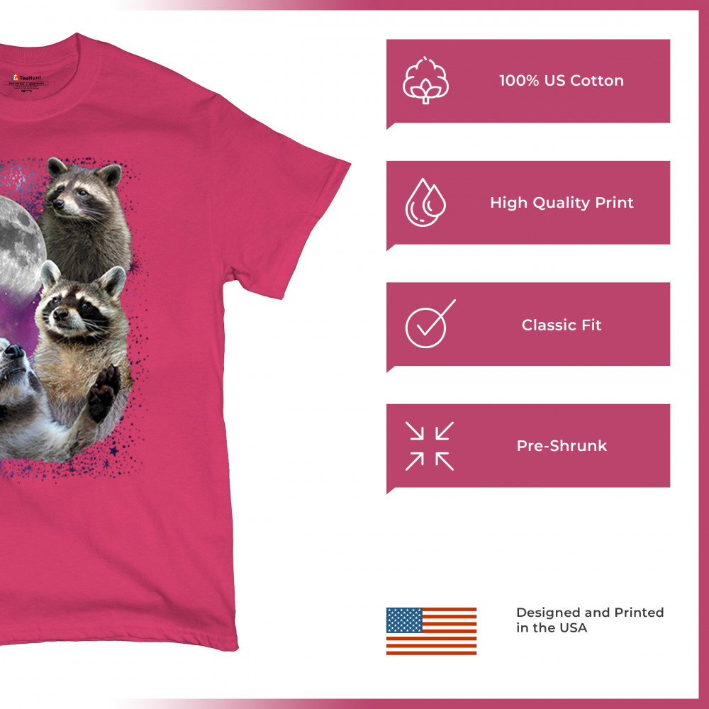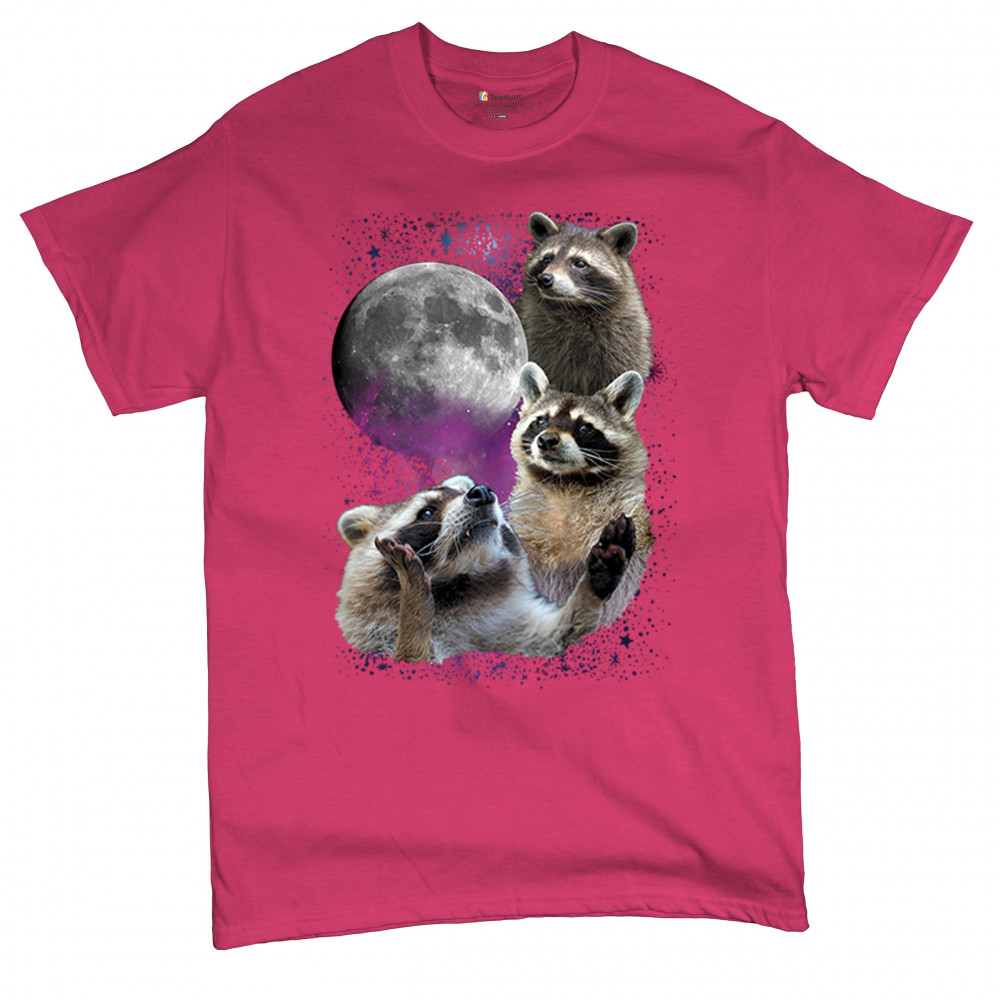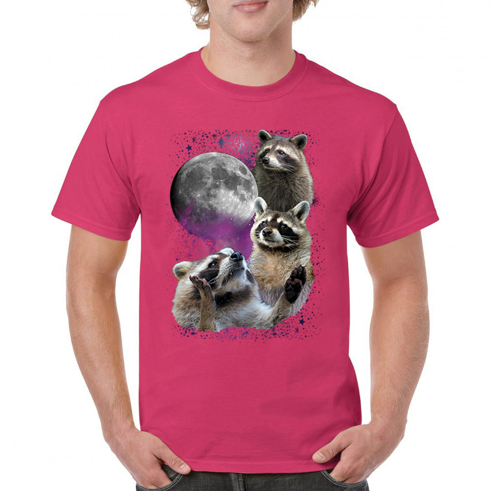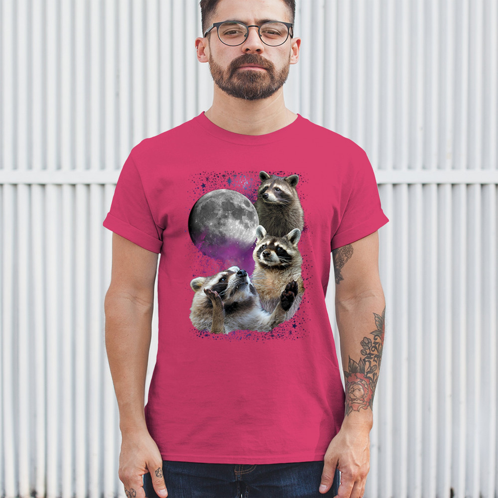 Embrace nature with this quirky raccoon and moon design, perfect for space and animal lovers. Ideal for casual wear or gifts.