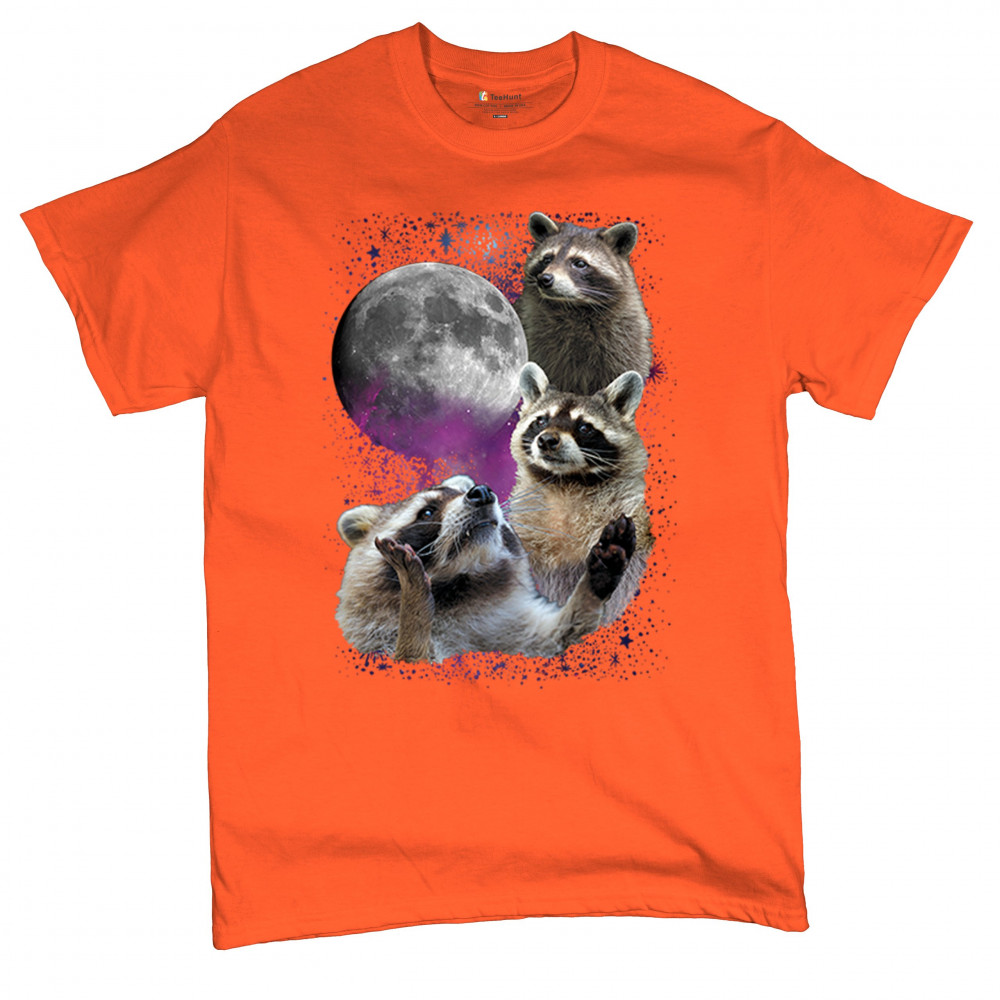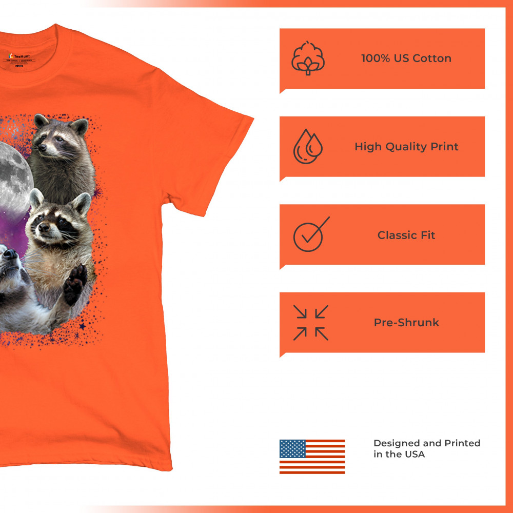 Embrace nature with this quirky raccoon and moon design, perfect for space and animal lovers. Ideal for casual wear or gifts.