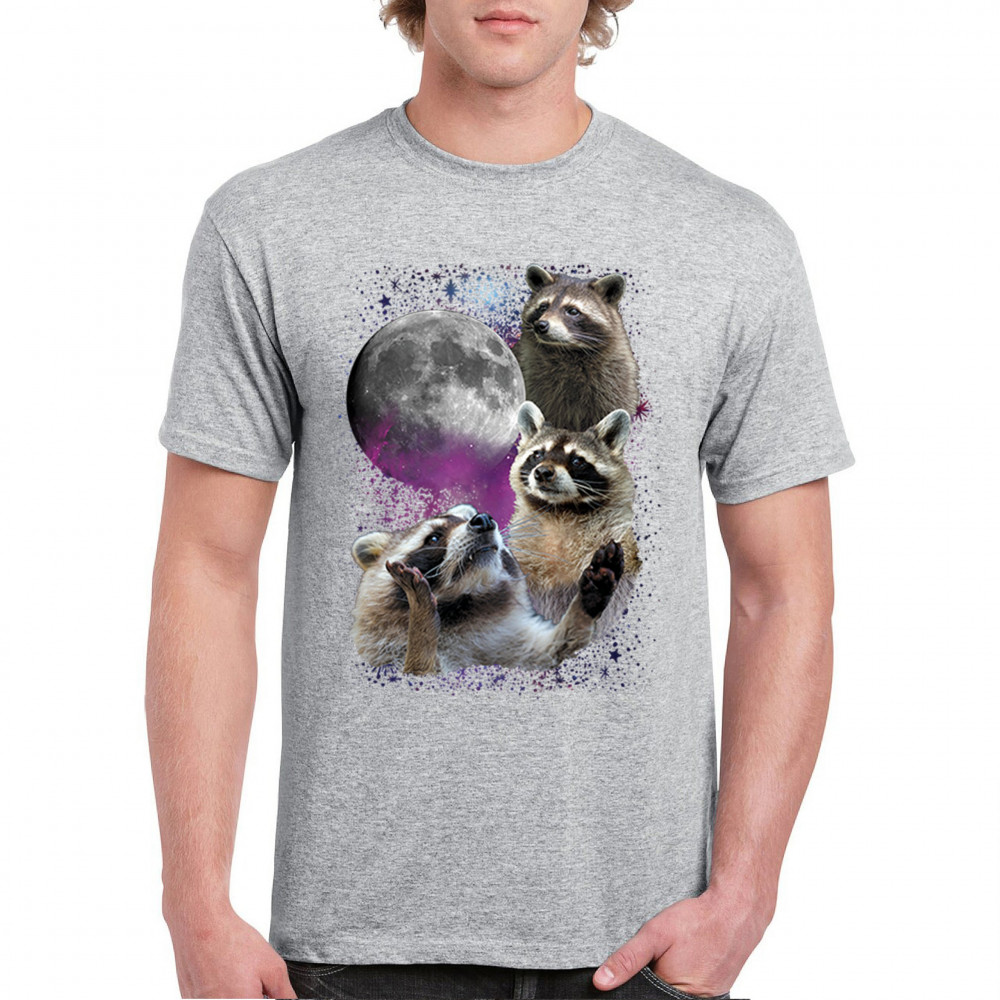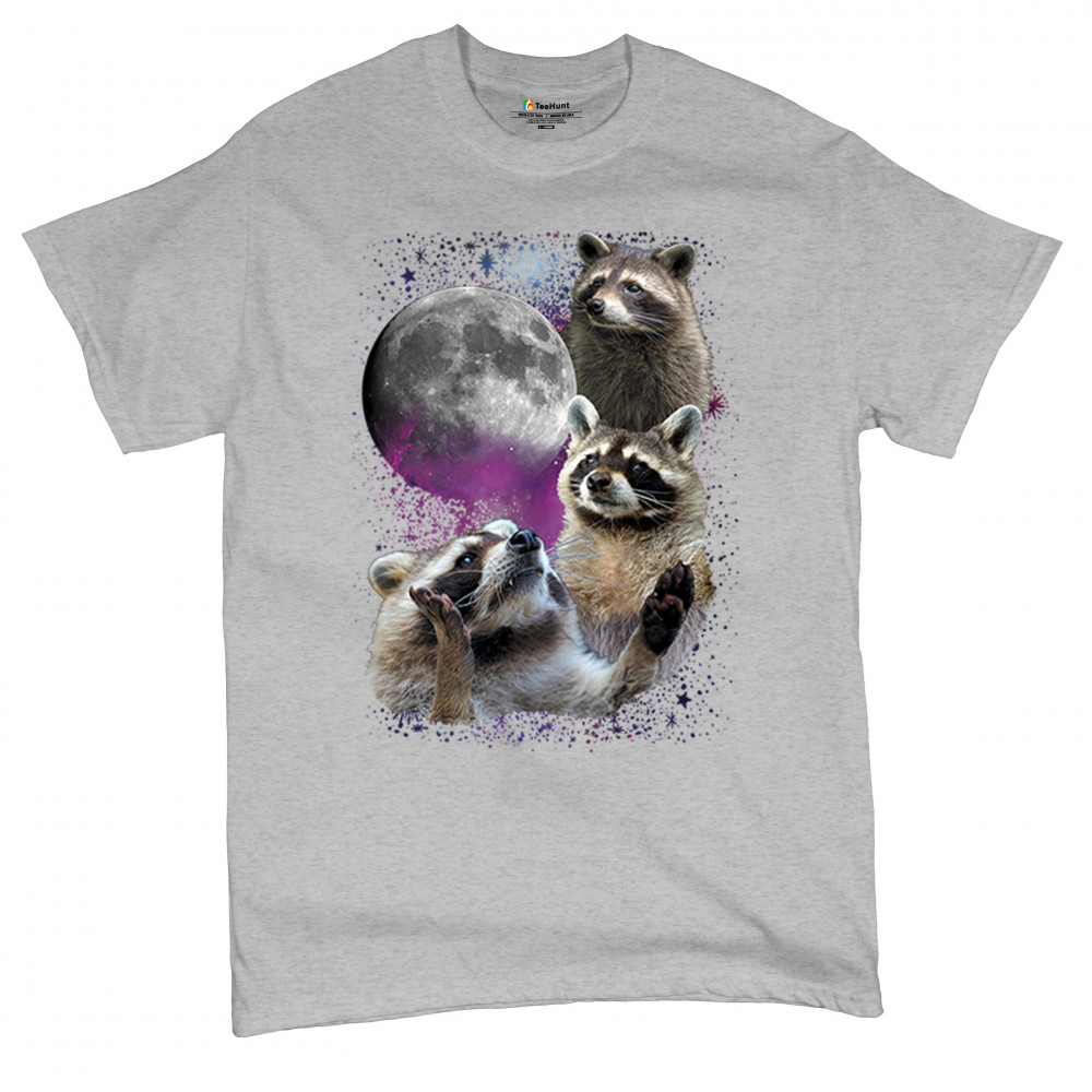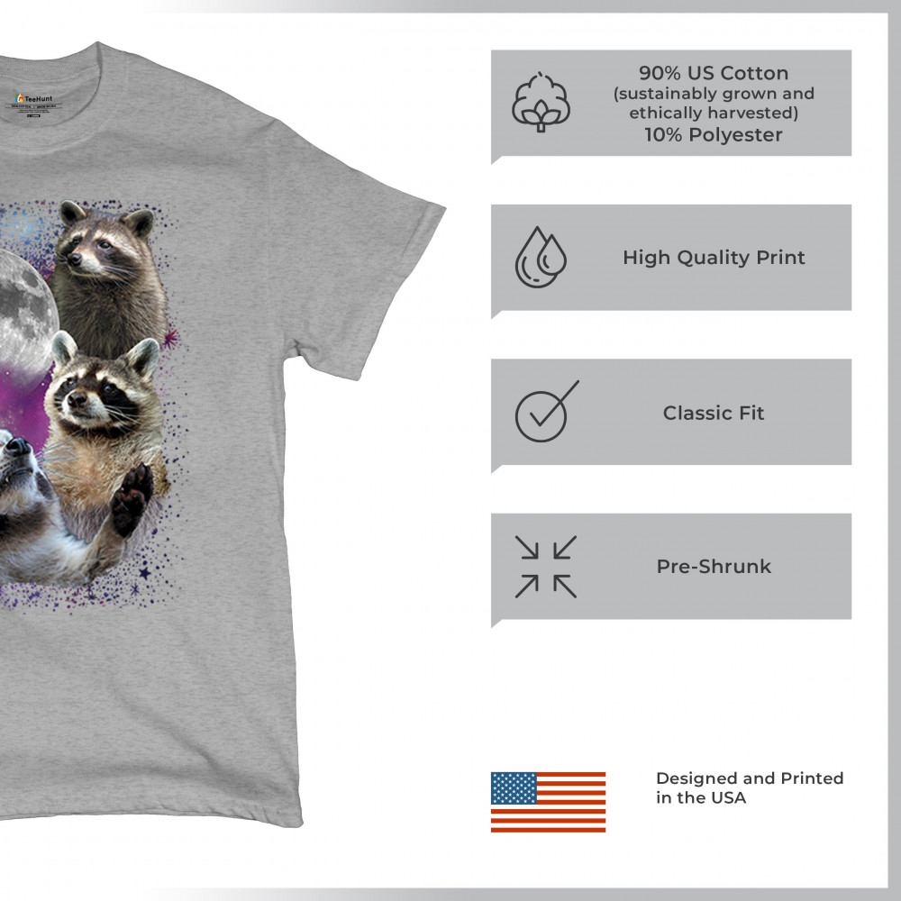Embrace nature with this quirky raccoon and moon design, perfect for space and animal lovers. Ideal for casual wear or gifts.