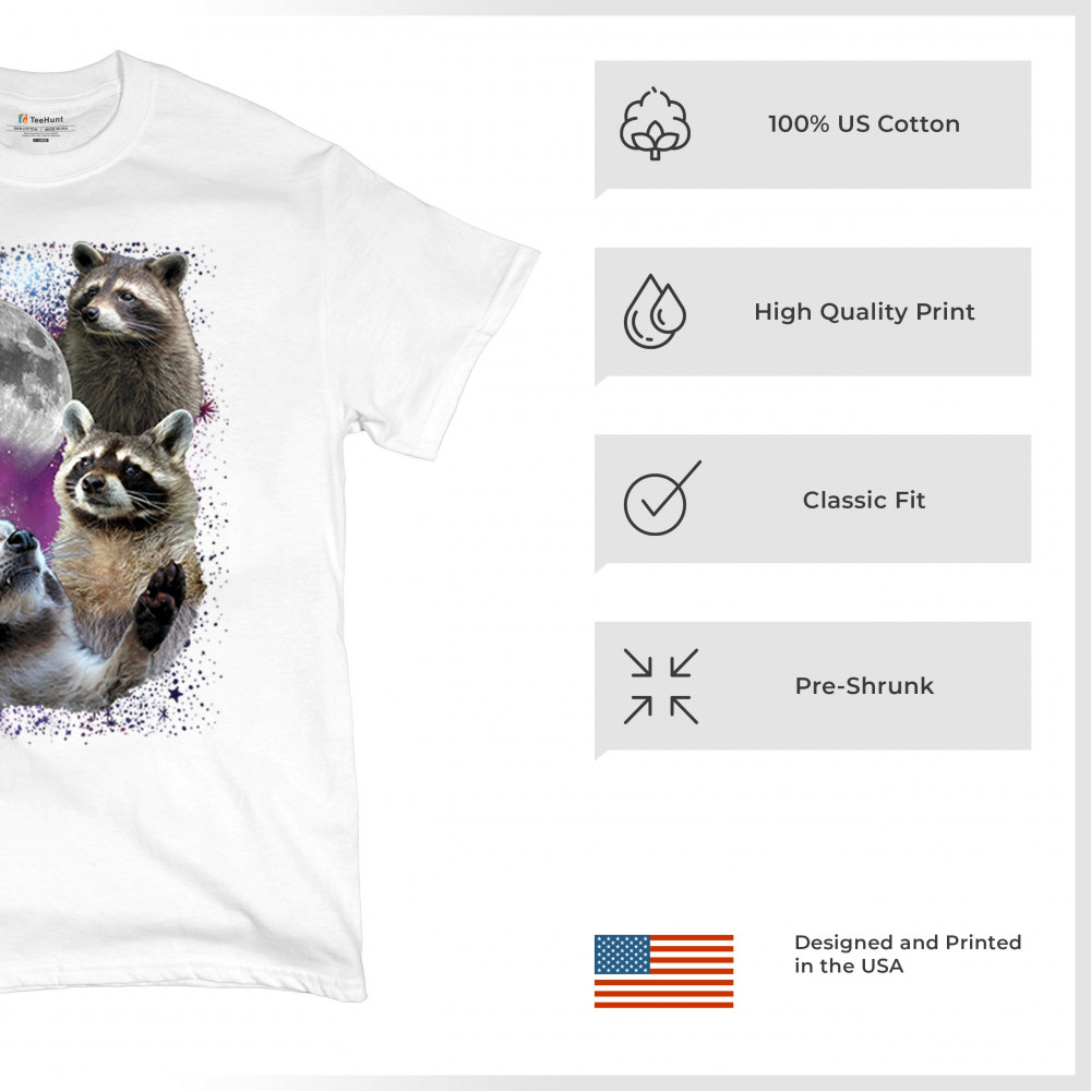 Embrace nature with this quirky raccoon and moon design, perfect for space and animal lovers. Ideal for casual wear or gifts.
