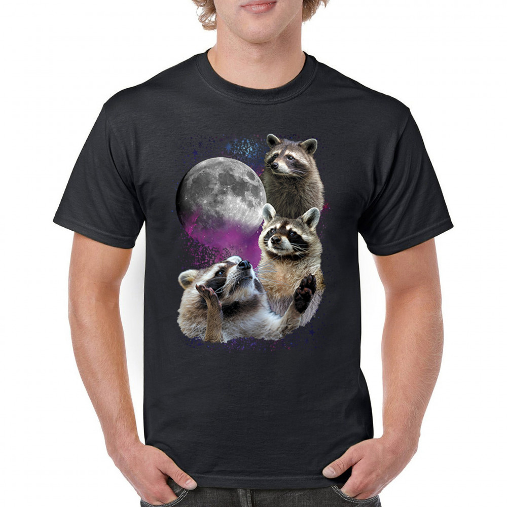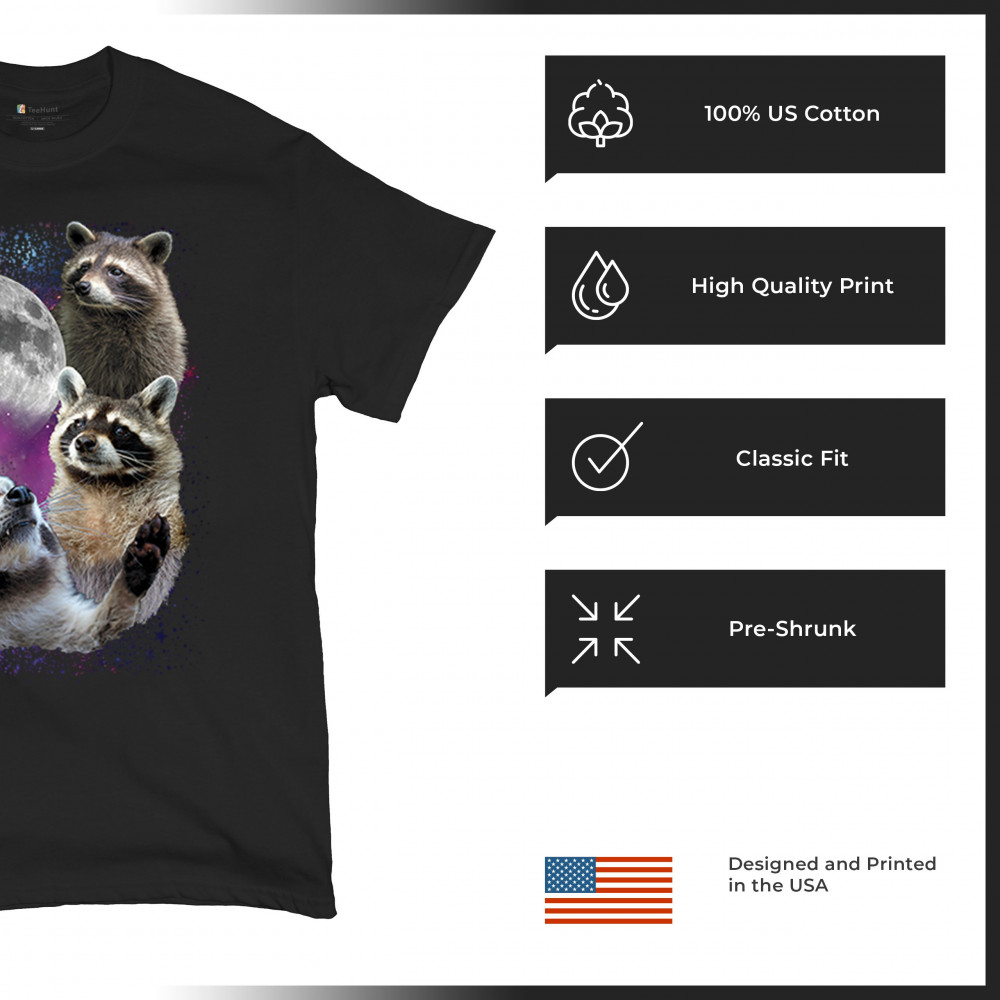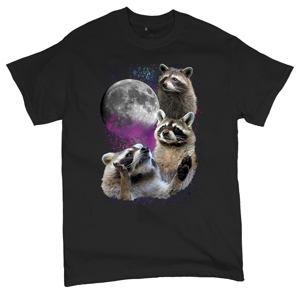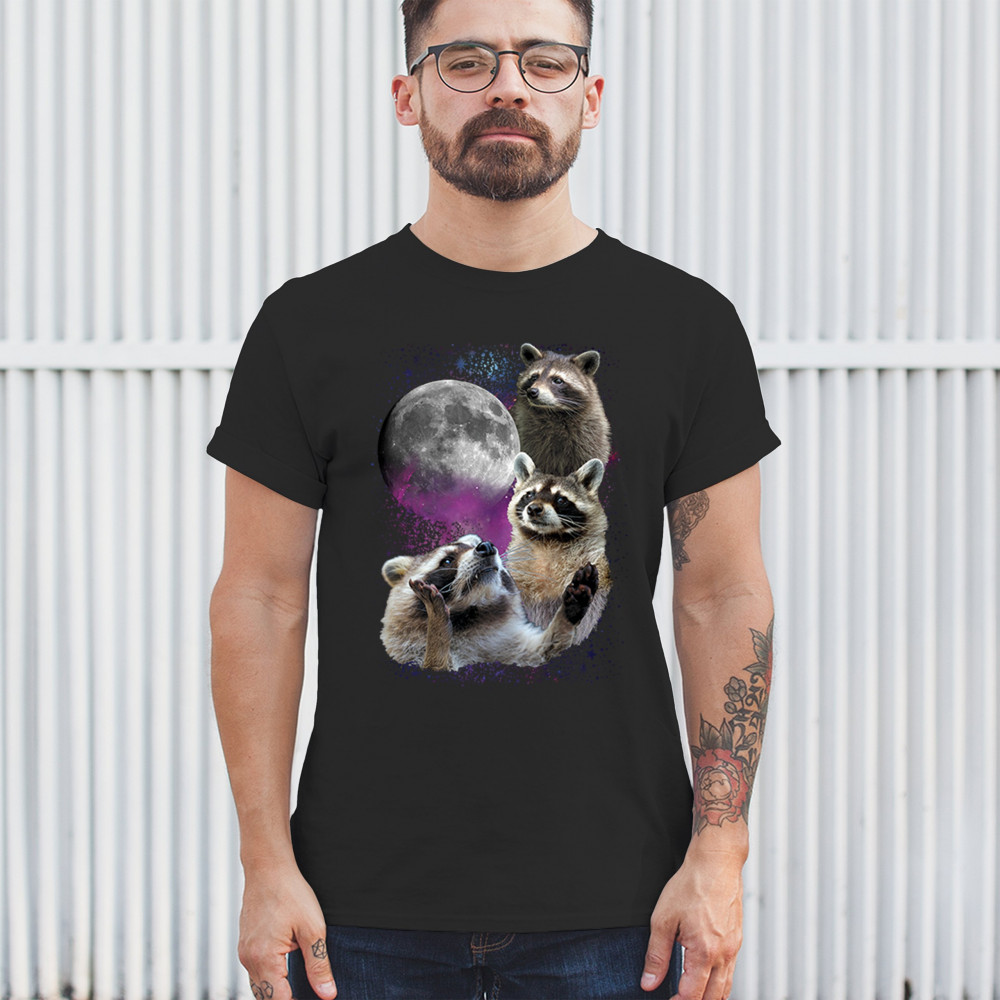 Embrace nature with this quirky raccoon and moon design, perfect for space and animal lovers. Ideal for casual wear or gifts.