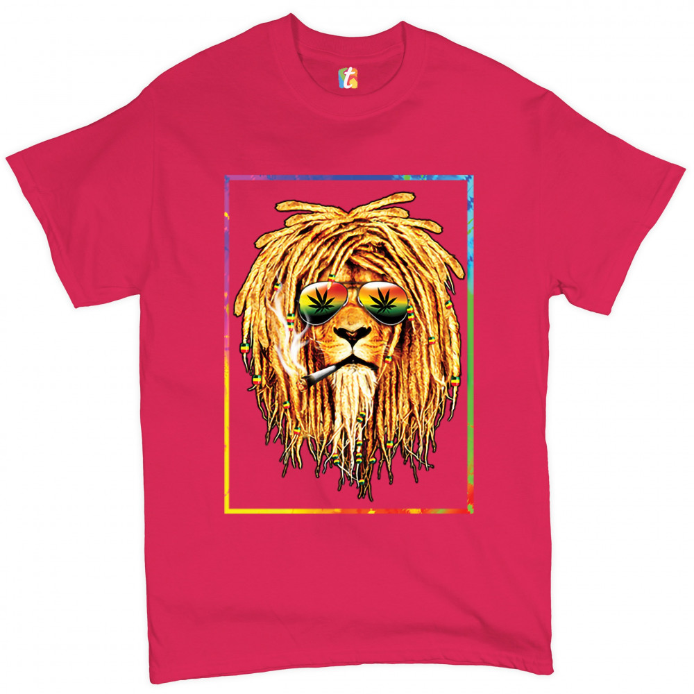 RASTA LION WEARING SUNGLASSES t-shirt 420 pot cannabis smoking jah men's tee hot pink