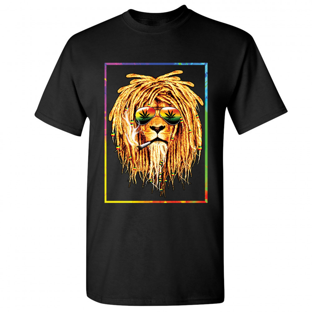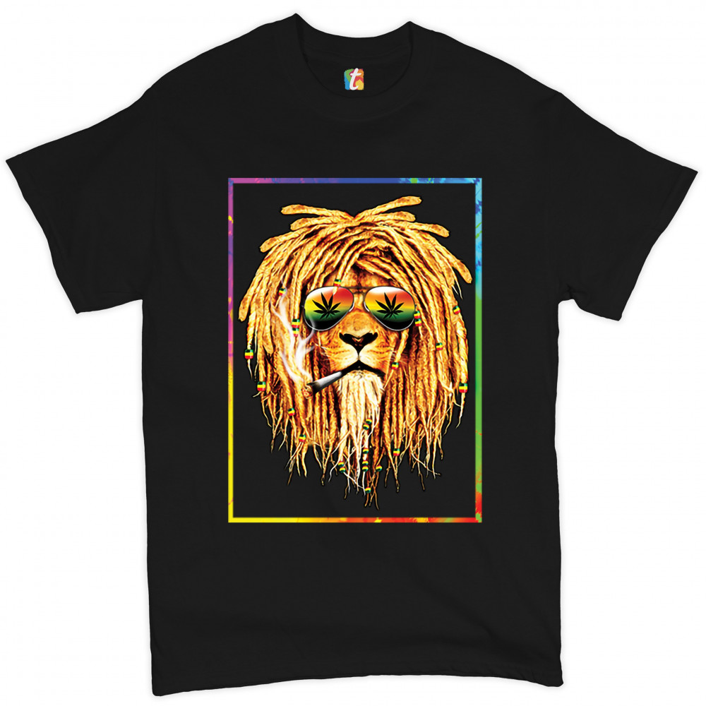 A print featuring a lion with dreadlocks smoking a joint and wearing sunglasses with marijuana leaves reflected in the them. The beads on the lion's dreadlocks and the glasses are painted with traditional Jamaican colors. Great choice for a pot aficionado