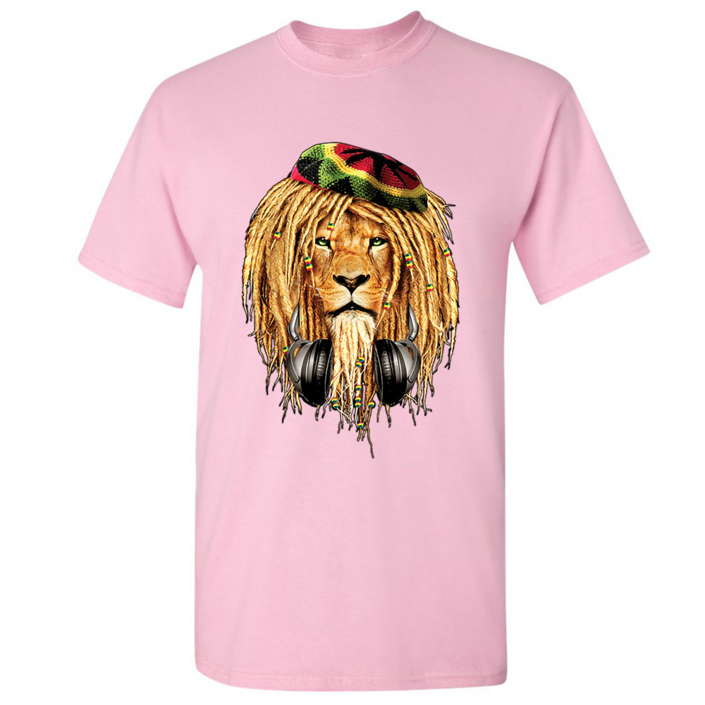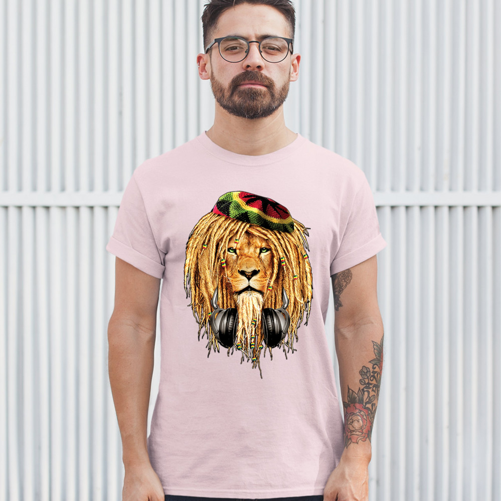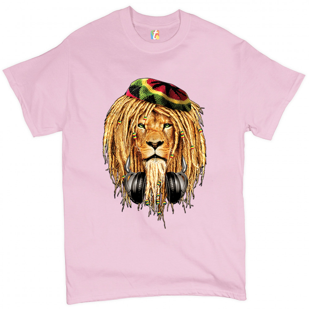 RASTA LION WITH HEADPHONES t-shirt jah jamaica reggae 420 culture men's tee light pink