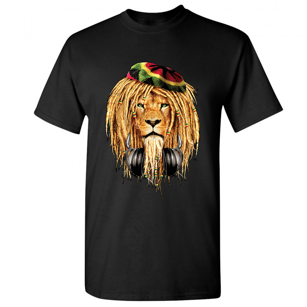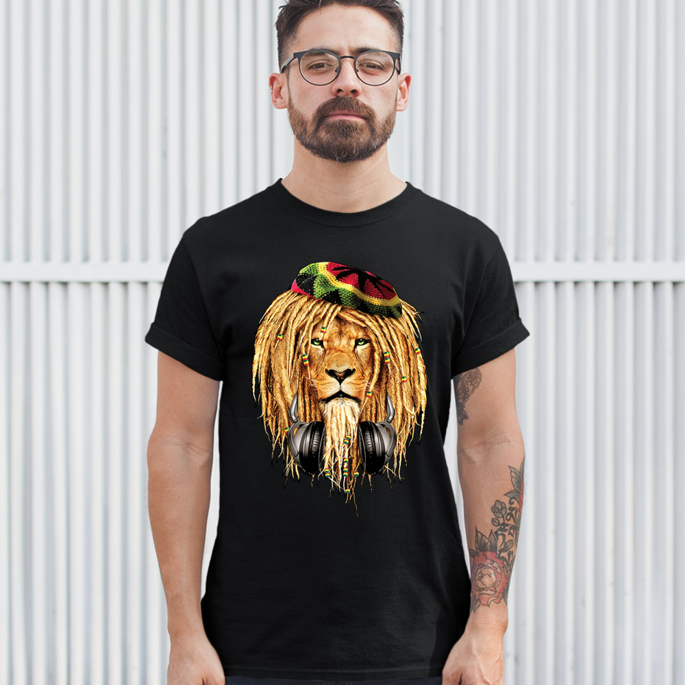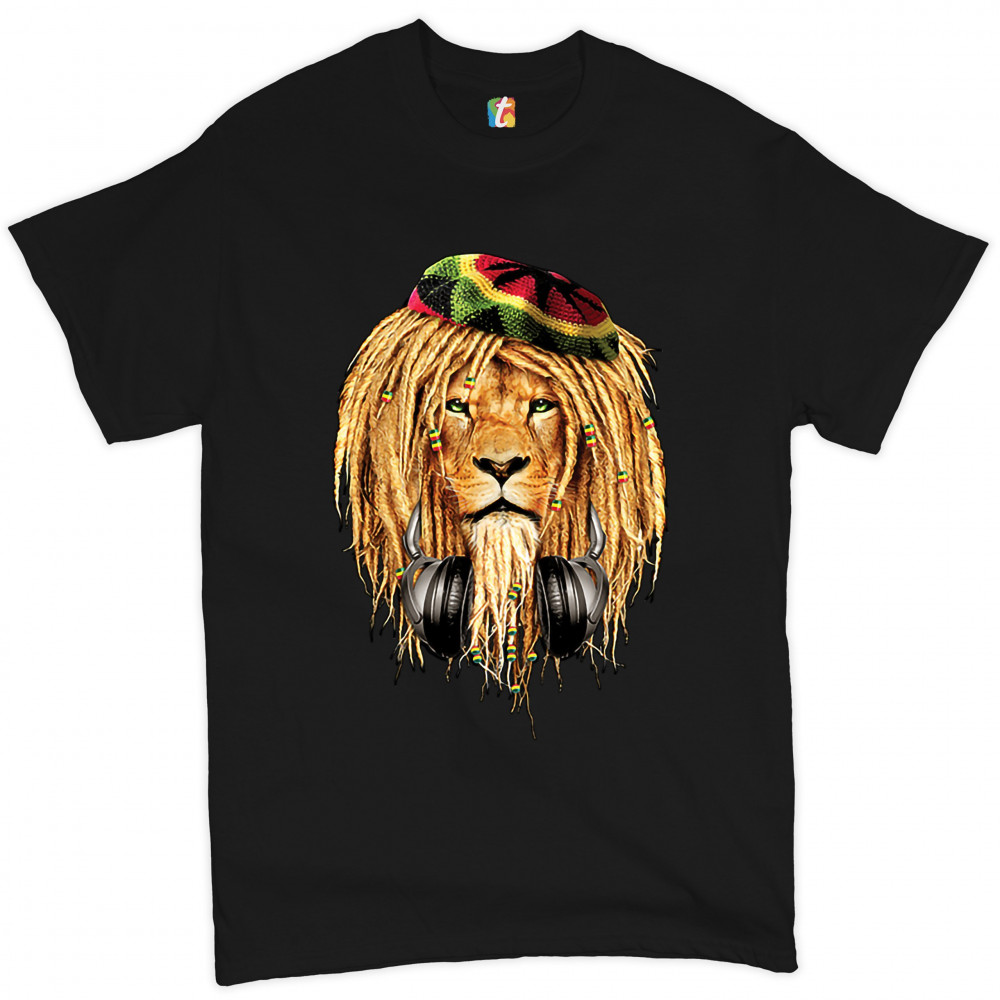 RASTA LION WITH HEADPHONES t-shirt jah jamaica reggae 420 culture men's tee black