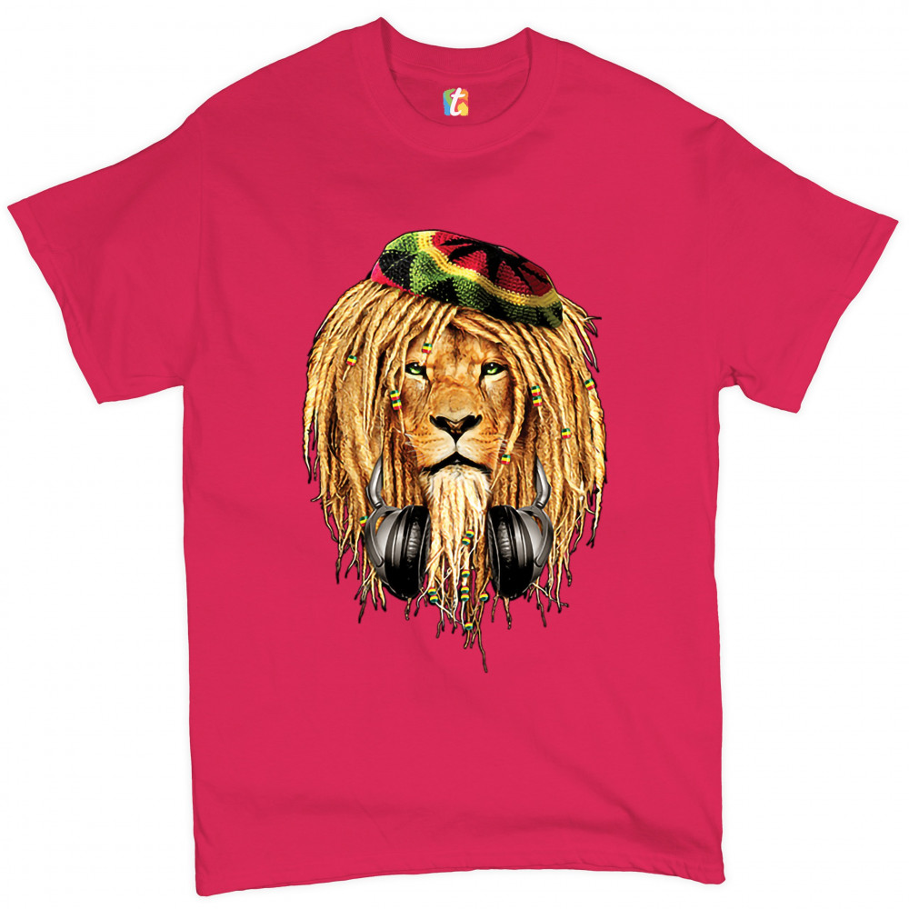 RASTA LION WITH HEADPHONES t-shirt jah jamaica reggae 420 culture men's tee hot pink