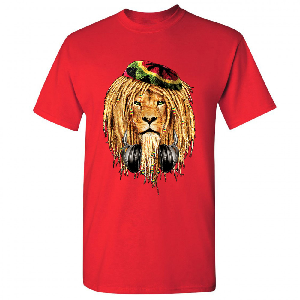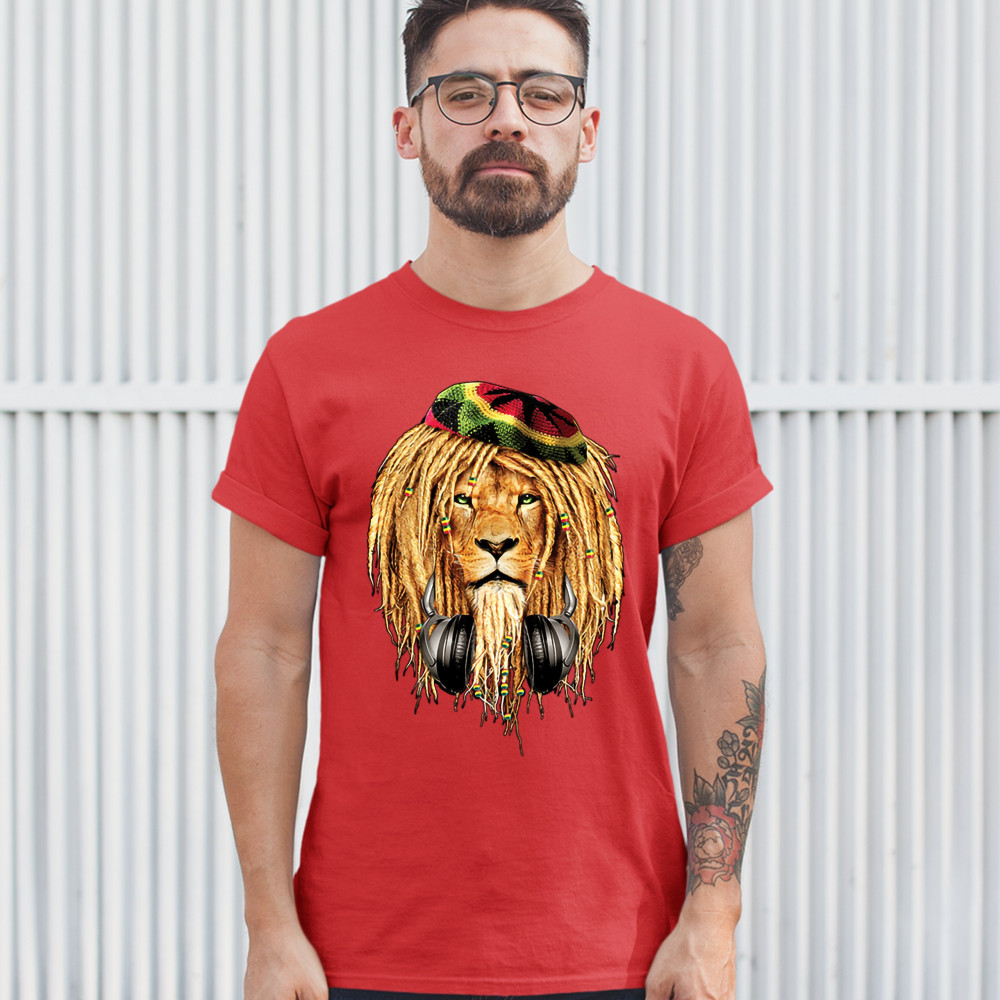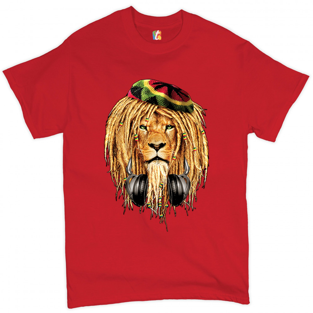 RASTA LION WITH HEADPHONES t-shirt jah jamaica reggae 420 culture men's tee red