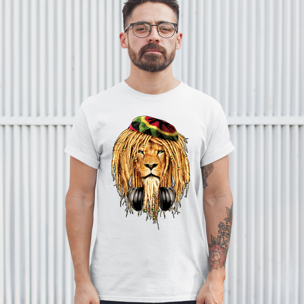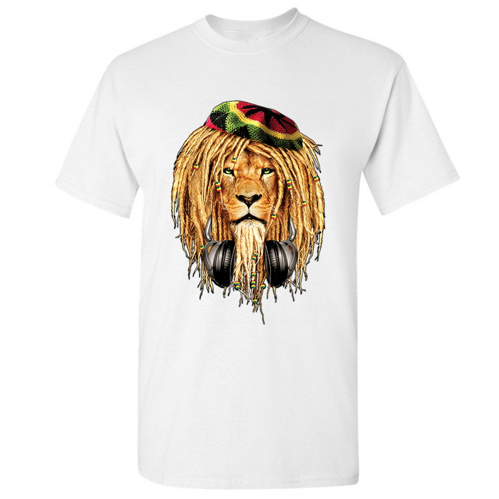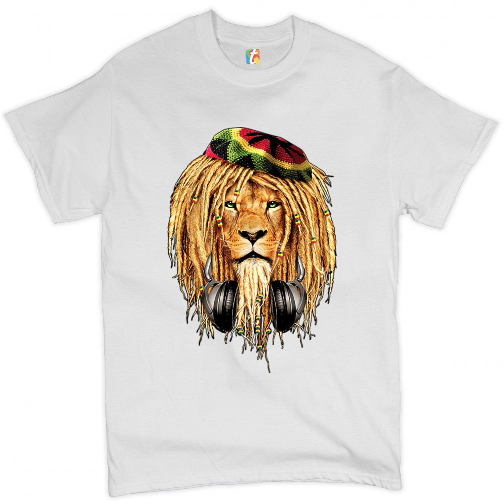 RASTA LION WITH HEADPHONES t-shirt jah jamaica reggae 420 culture men's tee white