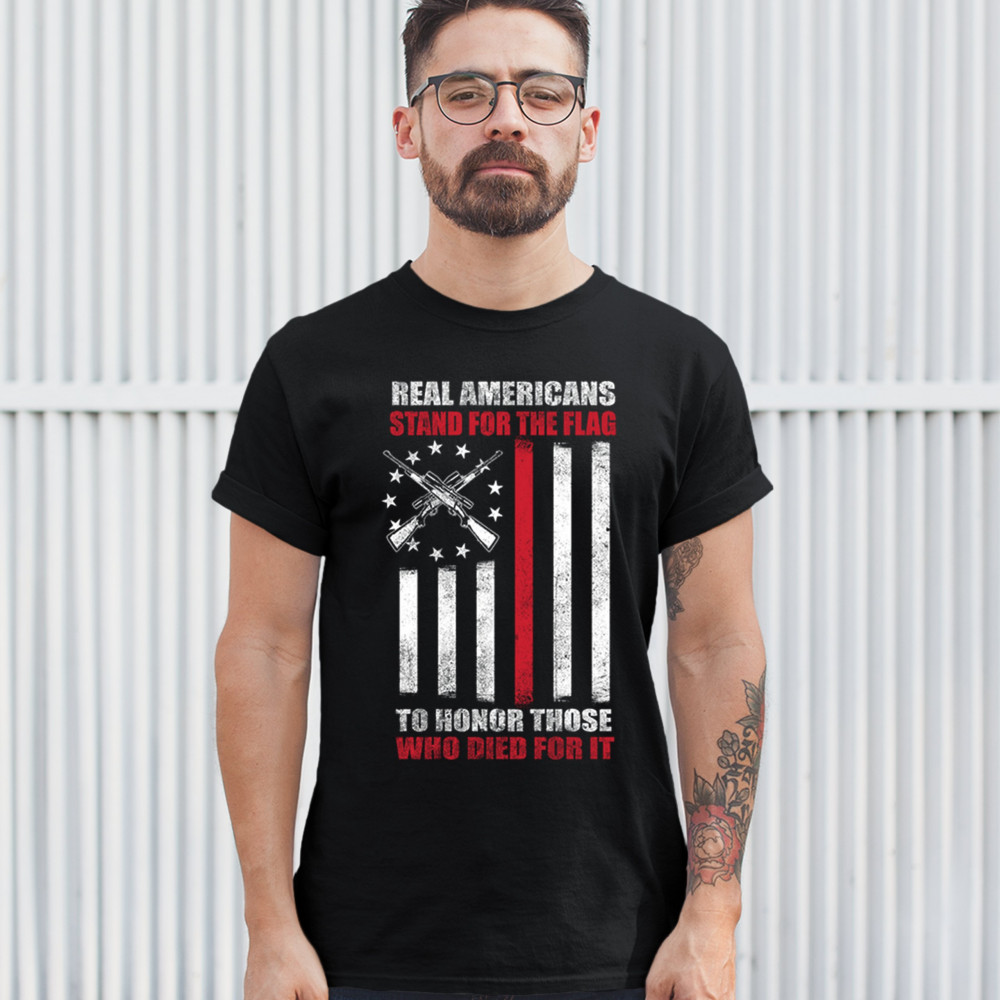 A patriotic print saying "Real Americans Stand for the Flag To Honor Those Who Died for It" and featuring a Betsy Ross American Flag with two crossed rifles inside the circle of stars and a thin red line insted of one of the stripes. Great choice to wear