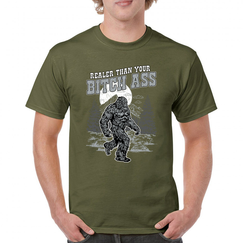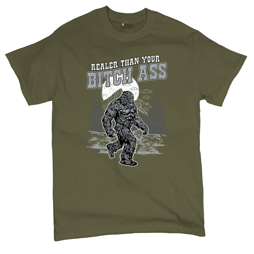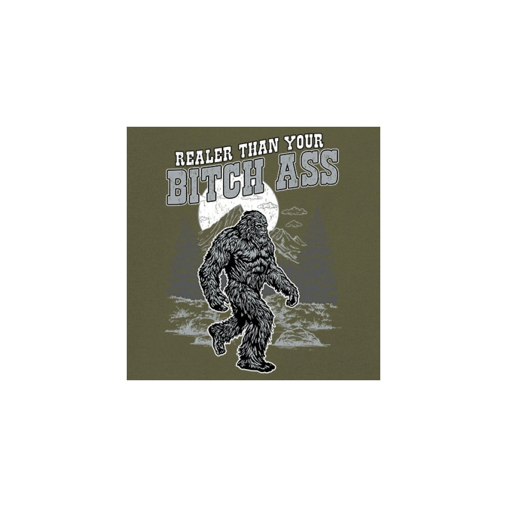 Edgy Bigfoot design with sarcastic cryptid humor and gritty wilderness style. Great for trolls, jokers, and rugged outdoors fans.